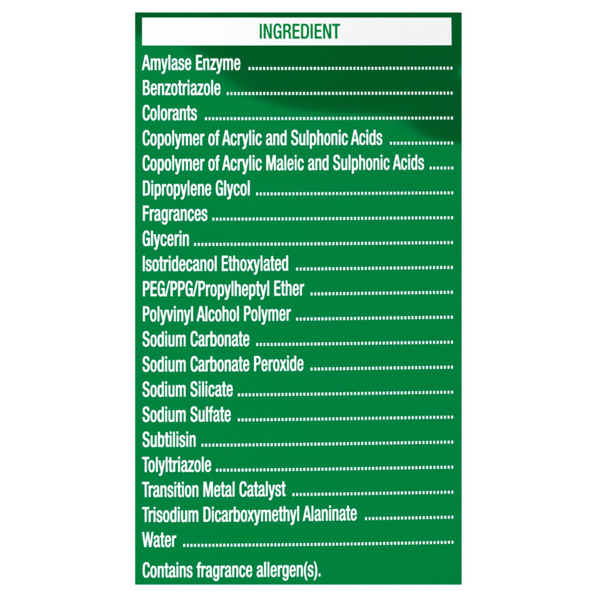 Amylase Enzyme, Benzotriazole, Colorants, Copolymer of Acrylic and Sulphonic Acids, Copolymer of Acrylic Maleic and Sulphonic Acids, Dipropylene Glycol, Fragrances, Glycerin, Isotridecanol Ethoxylated…