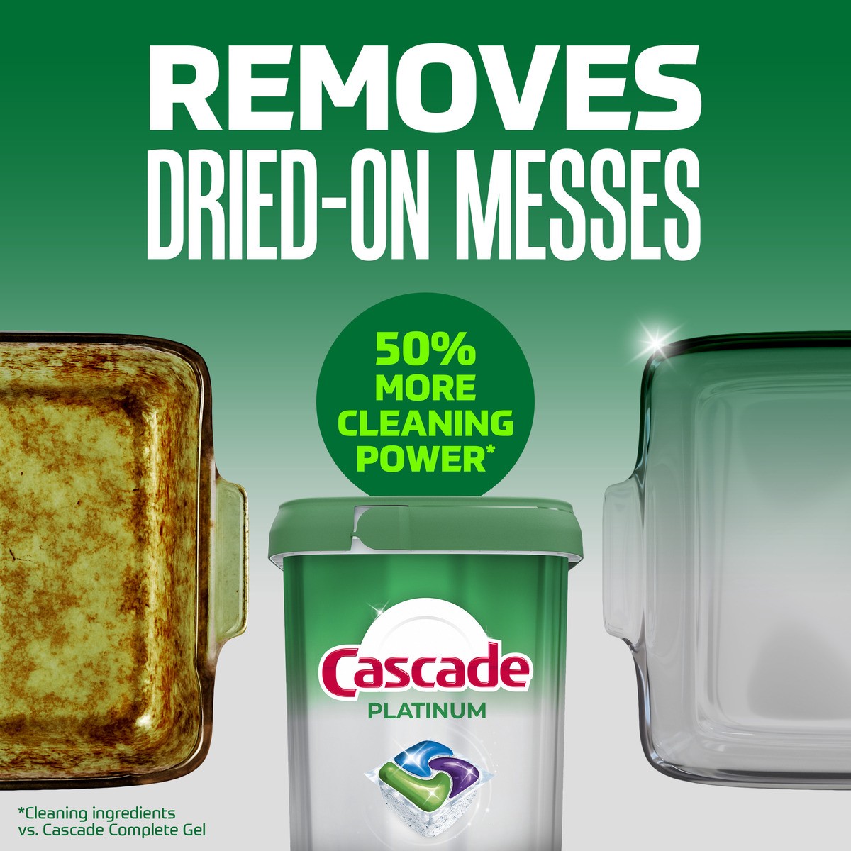 - REMOVES DRIED-ON MESSES: Cascade Platinum dishwasher ActionPacs remove dried on messes in just one wash, no pre-washing or rewashing required.