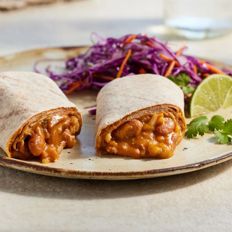 - The burritos are made from scratch with an organic tortilla, organic pinto beans, brown rice and Cheddar cheese, providing a filling microwave meal