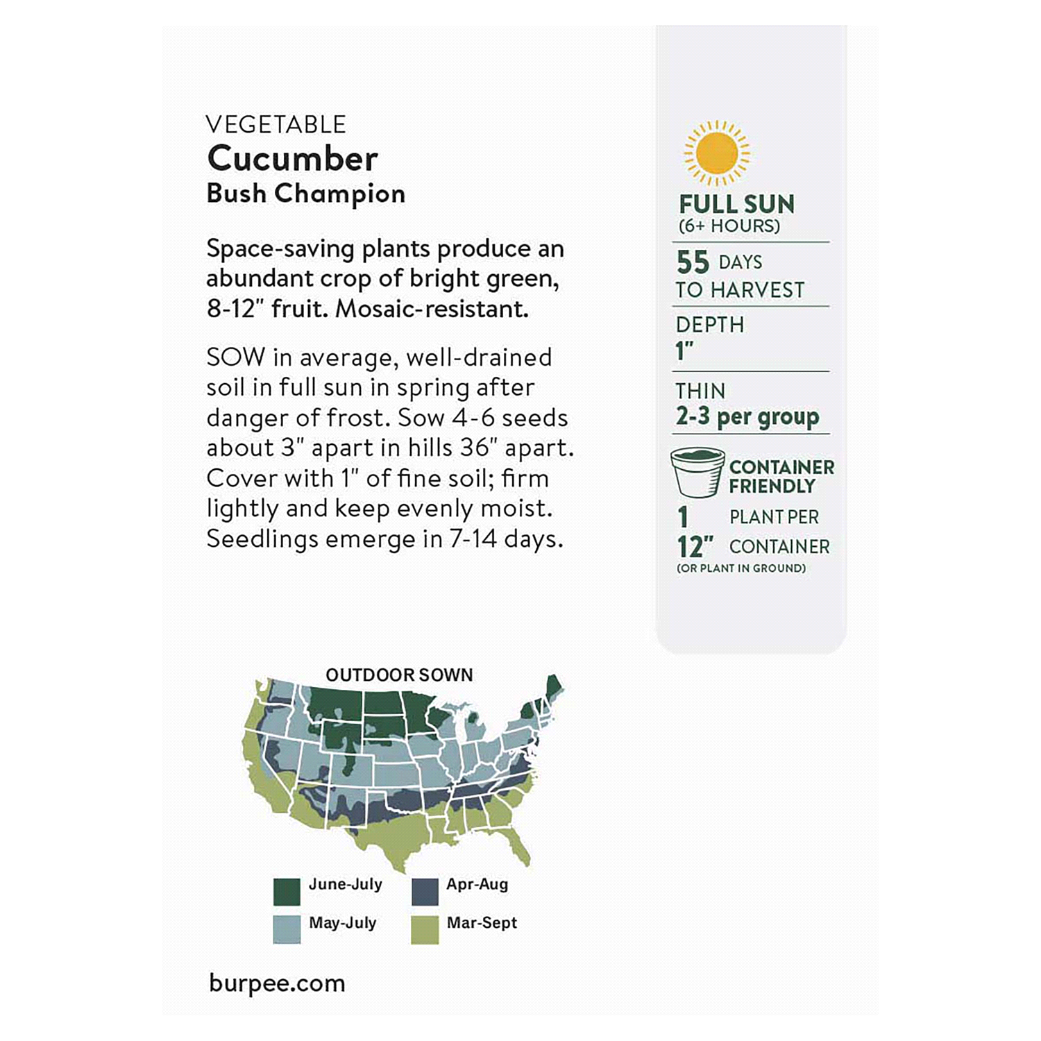 Space-saving plants produce abundant crop of bright green, 8-12" fruit. Mosaic-resistant.