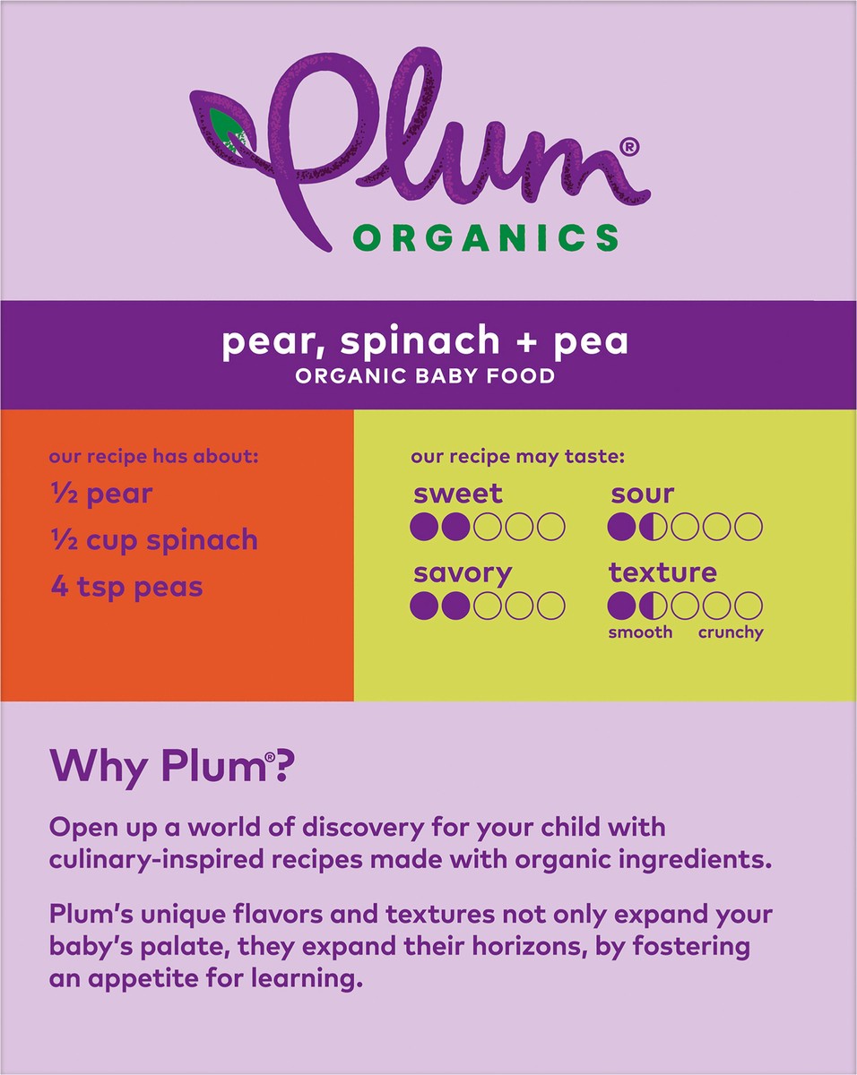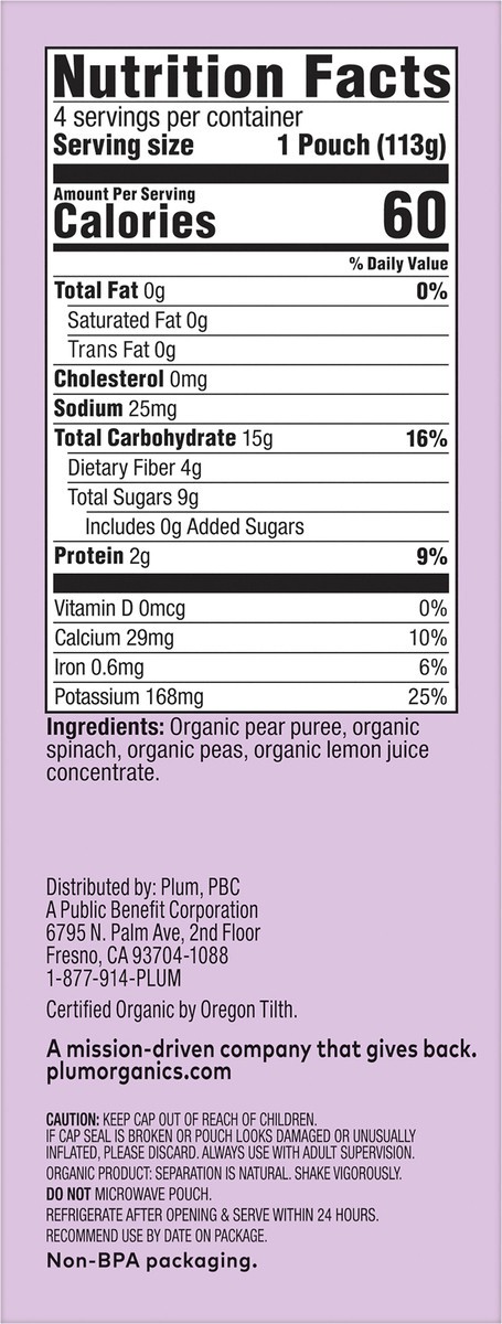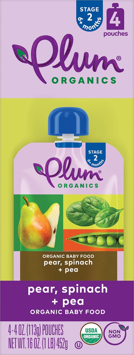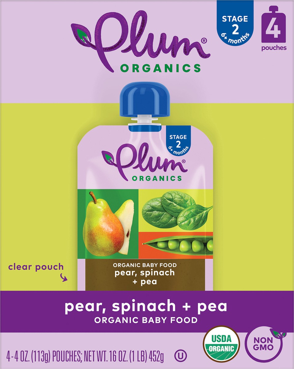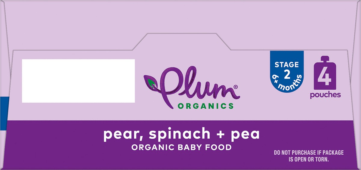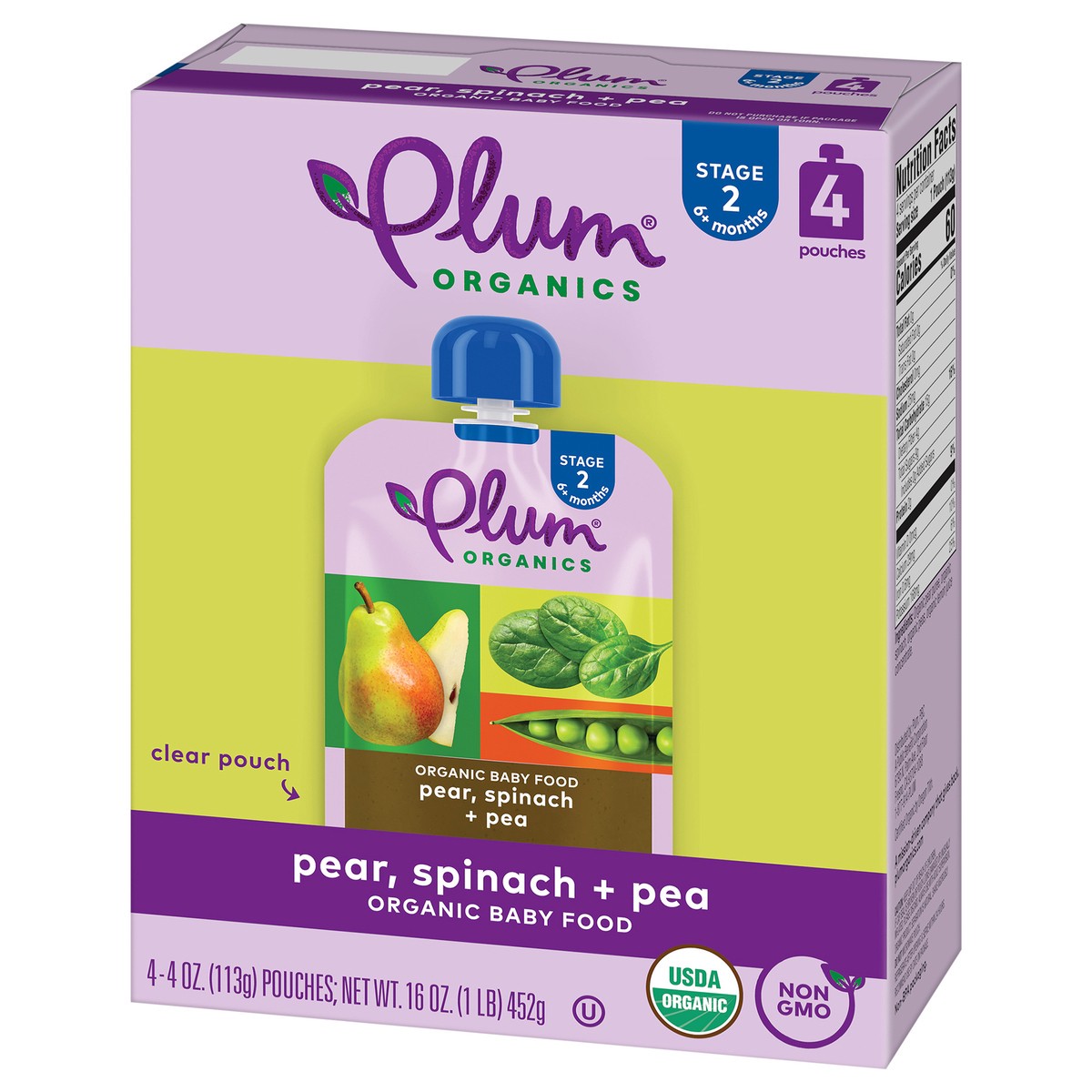Plum Organics Stage 2 Organic Baby Food Pear + Pea with Spinach 4oz Pouch-4-Pack