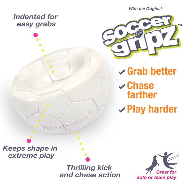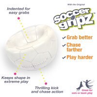 The Soccer Gripz toy is a soccer ball for dogs that offers a fresh take on traditional sports balls, featuring a pickup-indent shape that is easy for pups to grab and retrieve during playtime. It boun…