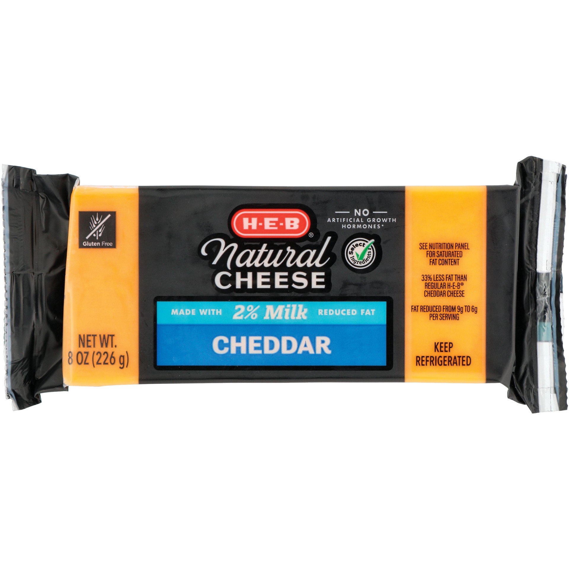 Made with 2% milk, this natural cheddar cheese has 33% less fat than our regular H-E-B Cheddar cheese block. This is a versatile and delicious cheddar - not too mild and not too sharp in flavor. Glute…