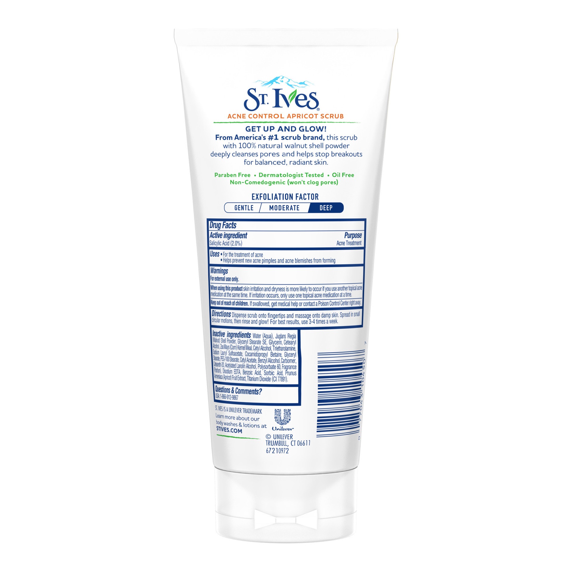 - BYE-BYE BLEMISHES: St. Ives Acne Control Face Scrub deeply cleans pores and contains 2% salicylic acid to help prevent blemishes from forming.