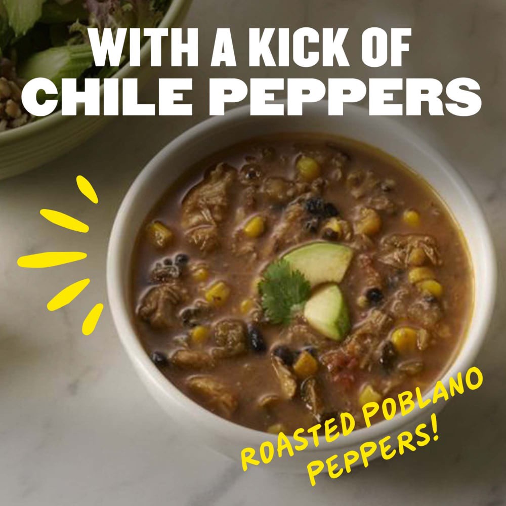 Water, Black Beans, White Meat Chicken Raised Without Antibiotics, Fire-Roasted Tomatoes, Roasted Corn, Onions, Corn, Tomato Juice, Roasted Green Chiles, Tortilla Chips (Corn Flour, Sunflower Oil, Sal…
