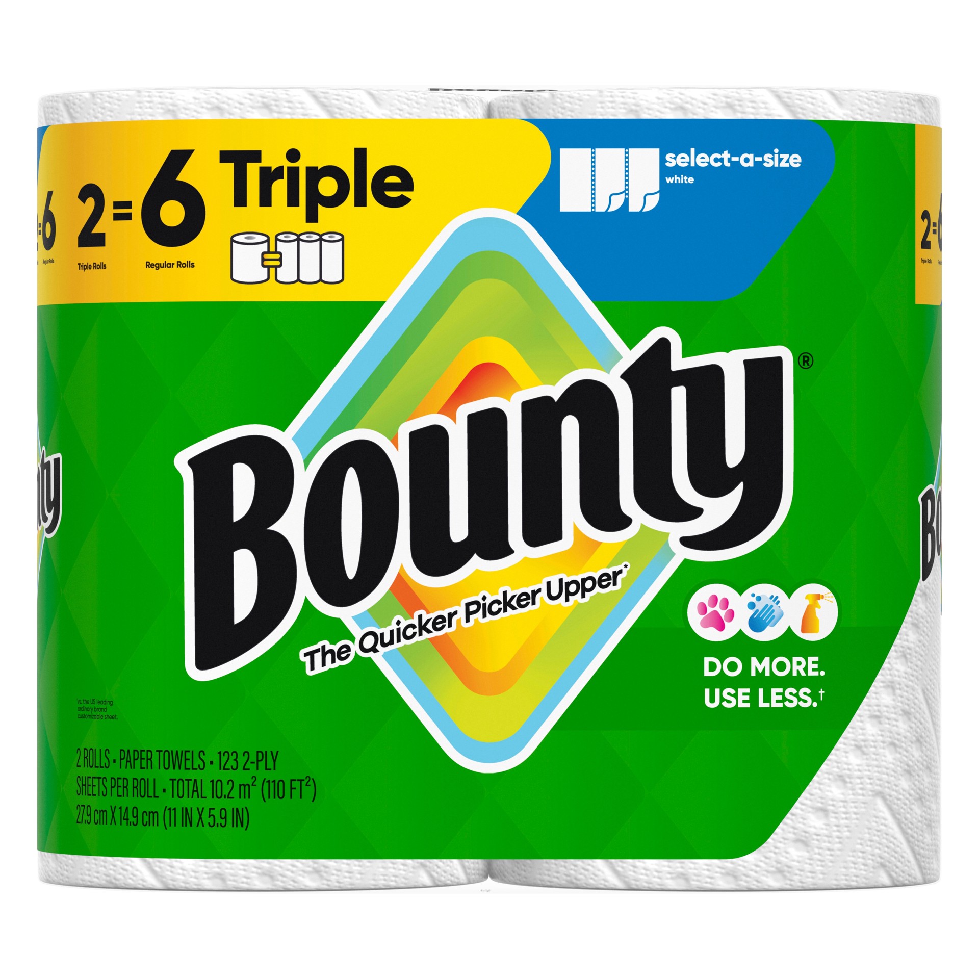 Pack contains 2 Triple Rolls of white Bounty Select-A-Size Paper Towels. 2 Triple Rolls = 6 Regular Rolls. Select-A-Size sheets help you customize how much to use for each task. Picks up spills and me…