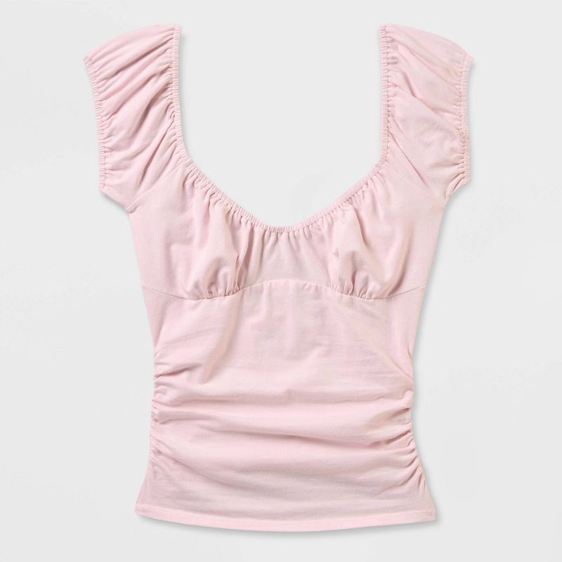 Emma top from Wild Fable™ with ruched detailing. Features a scoop neckline and cap sleeves, highlighted with elastic-cinched trimming. Made from a lightweight woven fabric blend of cotton, recycled co…
