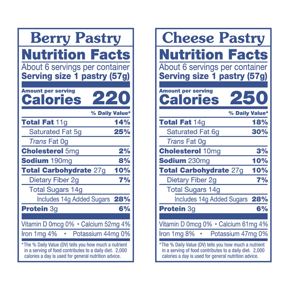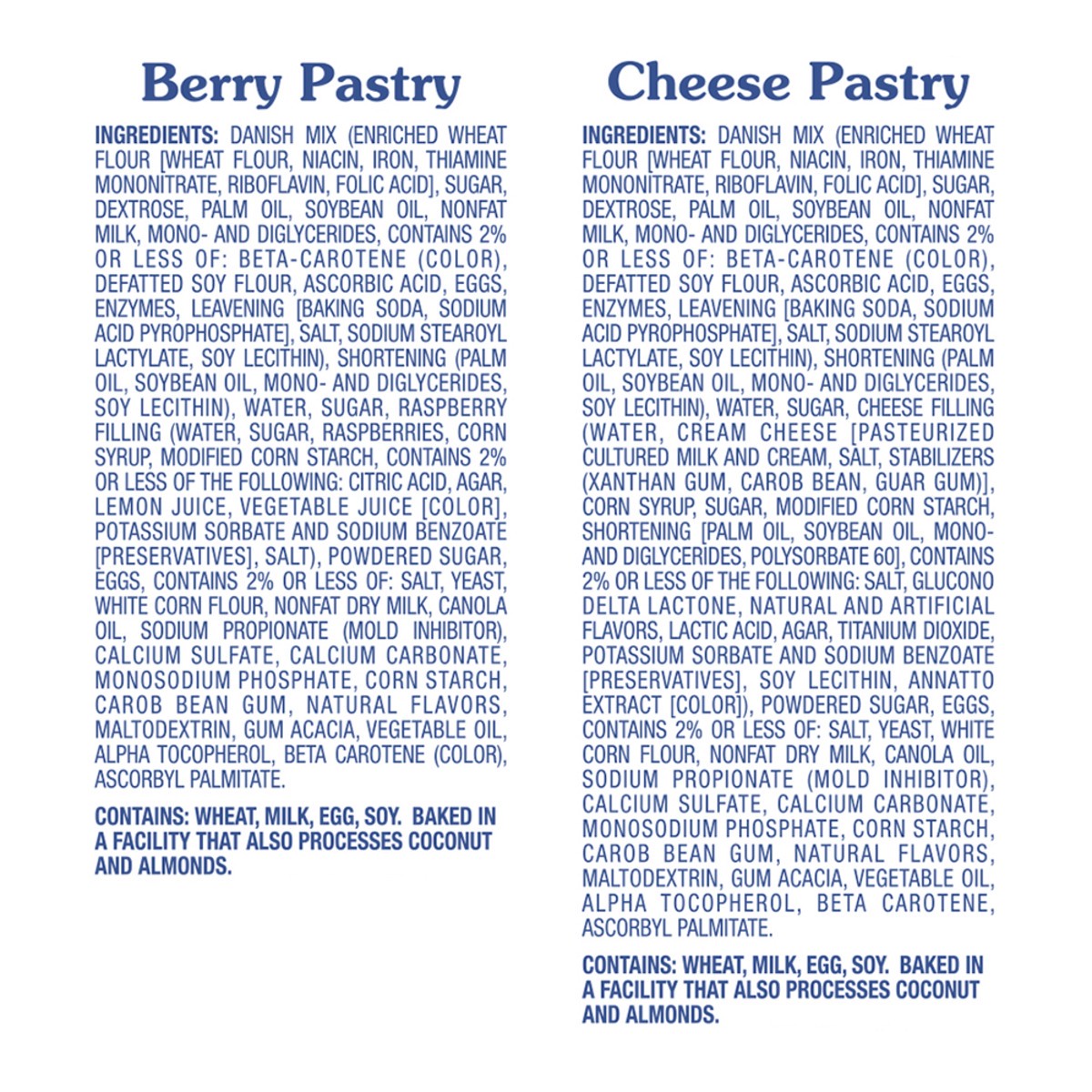 Berry Pastry: Danish Mix (Enriched Wheat Flour [Wheat Flour, Niacin, Iron, Thiamine Mononitrate, Riboflavin, Folic Acid], Sugar, Dextrose, Palm Oil, Soybean Oil, Nonfat Milk, Mono- and Diglycerides, C…
