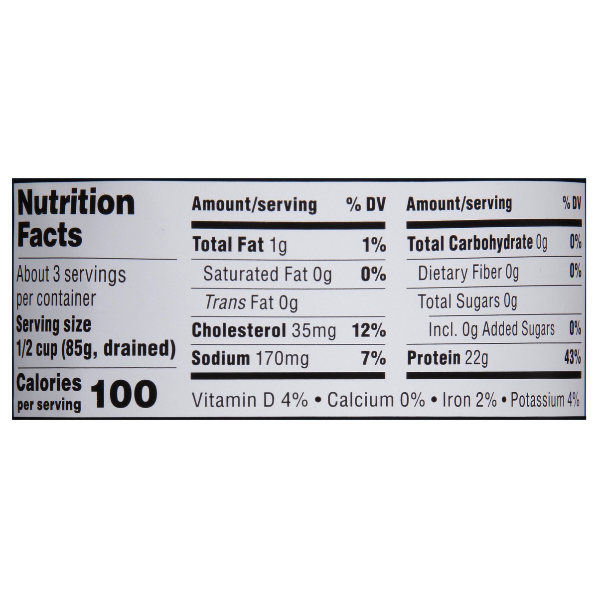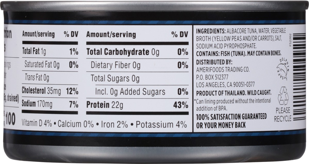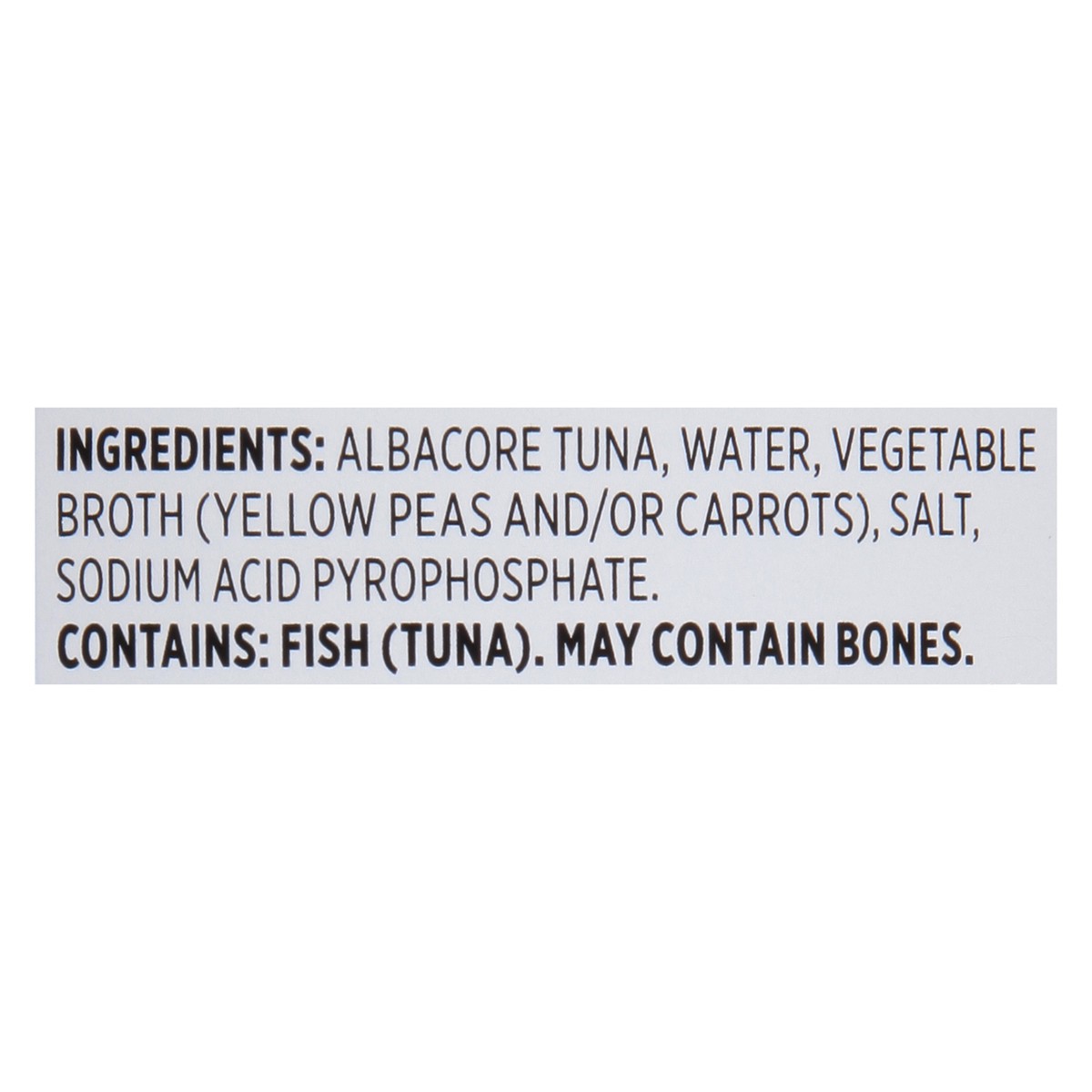 Albacore Tuna, Water, Vegetable Broth (Yellow Peas and/or Carrots), Salt, Sodium Acid Pyrophosphate.