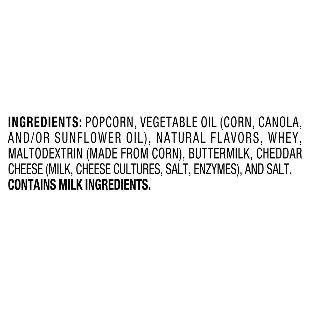 Popcorn, Vegetable Oil (Corn, Canola, And/Or Sunflower Oil), Natural Flavors, Whey, Maltodextrin (Made From Corn), Buttermilk, Cheddar Cheese (Milk, Cheese Cultures, Salt, Enzymes), And Salt. Contains…