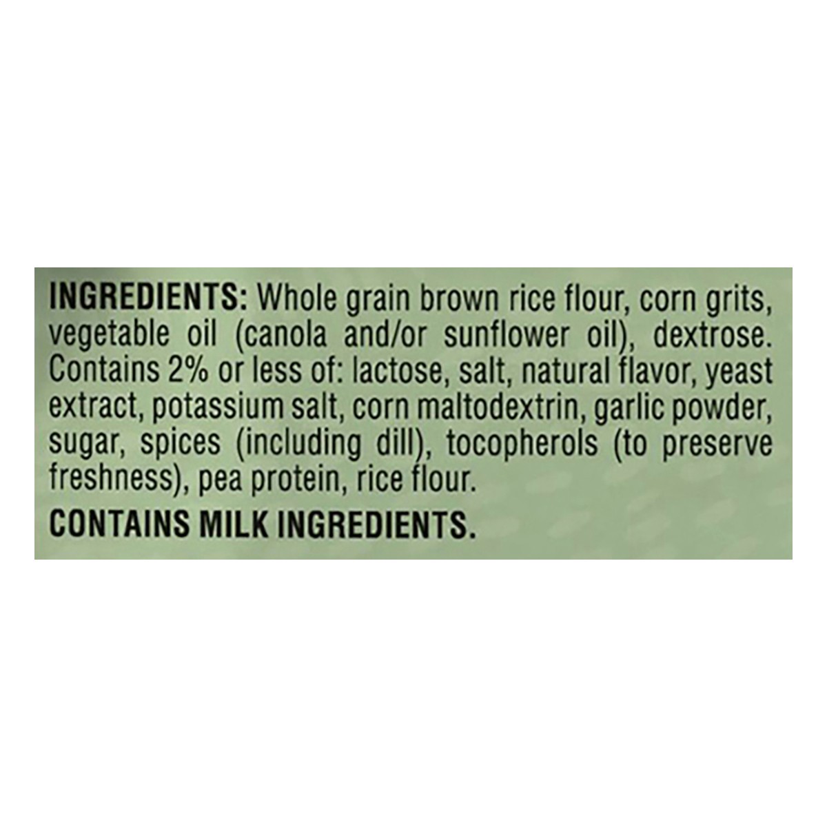 Whole Grain Brown Rice Flour, Corn Grits, Vegetable Oil (Canola and/or Sunflower Oil), Dextrose, Contains 2% or Less of: Lactose, Salt, Natural Flavor, Yeast Extract, Potassium Salt, Corn Maltodextrin…