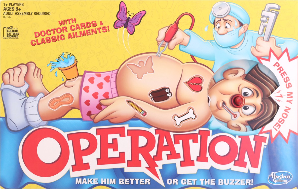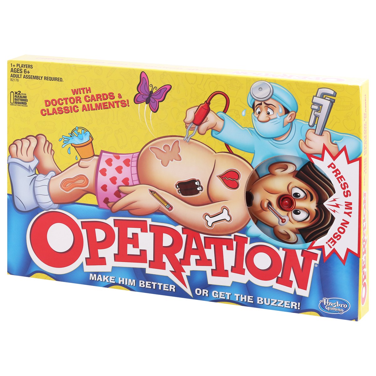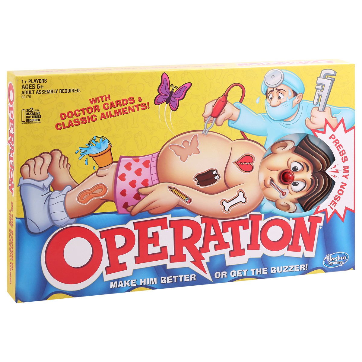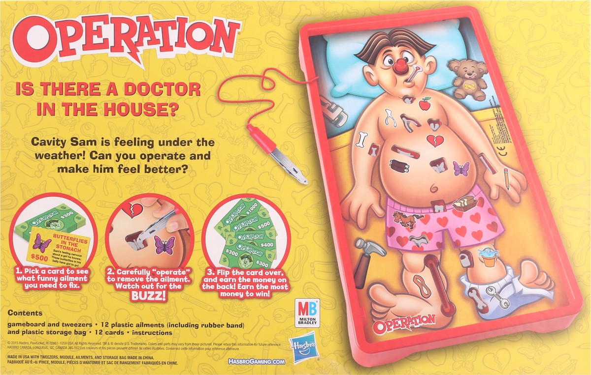 Ages 6+. Contents: gameboard and tweezers. 12 plastic ailments (including rubber band) and plastic storage bag. 12 cards. instructions. 1+ players. Adult assembly required. With doctor cards & classic…