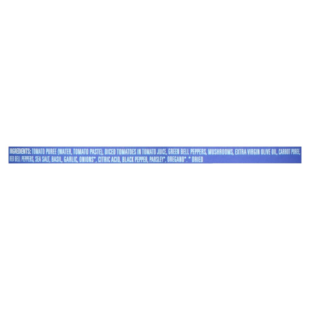 Tomato Puree (Water, Tomato Paste), Diced Tomatoes in Tomato Juice, Green Bell Peppers, Mushrooms, Extra Virgin Olive Oil, Carrot Puree, Red Bell Peppers, Sea Salt, Basil, Garlic, Onions*, Citric Acid…