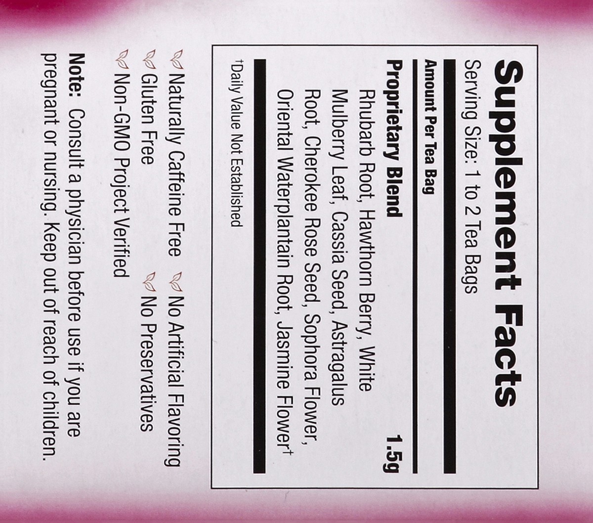 Proprietary Blend: Rhubarb Root, Hawthorn Berry, White Mulberry Leaf, Cassia Seed, Astragalus Root, Cherokee Rose Seed, Sophora Flower, Oriental Waterplantain Root, Jasmine Flower.