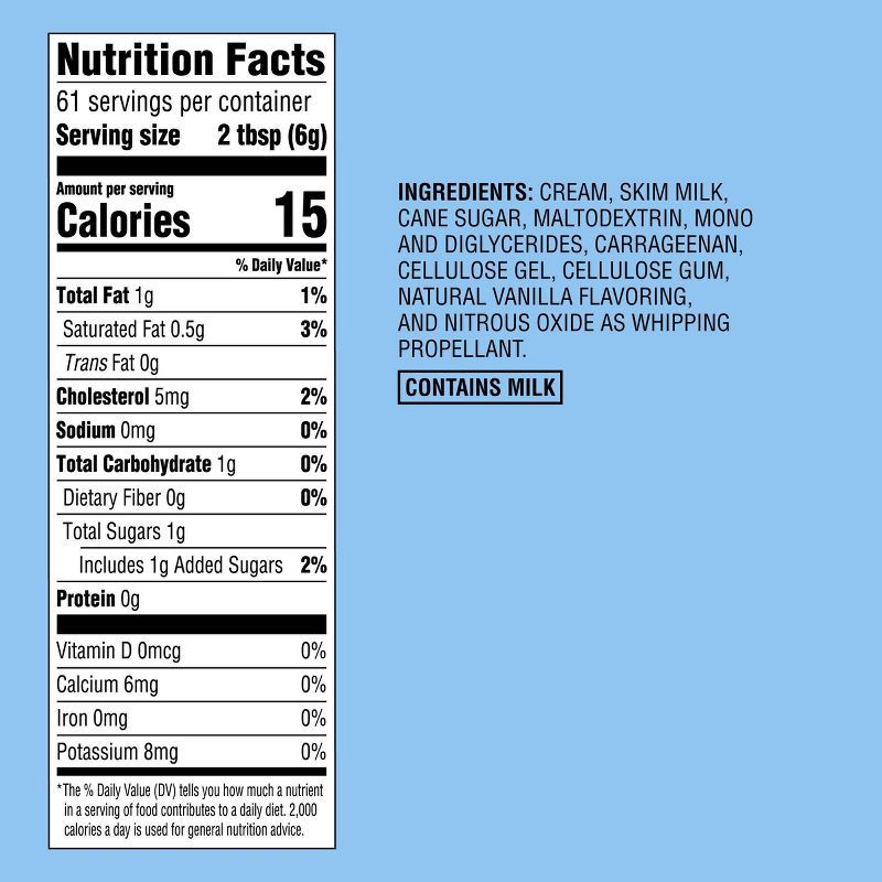 CREAM, WATER, CANE SUGAR, MALTODEXTRIN, NONFAT DRY MILK, MONO- AND DIGLYCERIDES, DEXTROSE, CARRAGEENAN, CELLULOSE GUM, CELLULOSE GEL, VANILLA EXTRACT, NITROUS OXIDE.