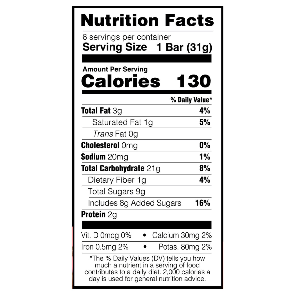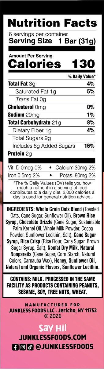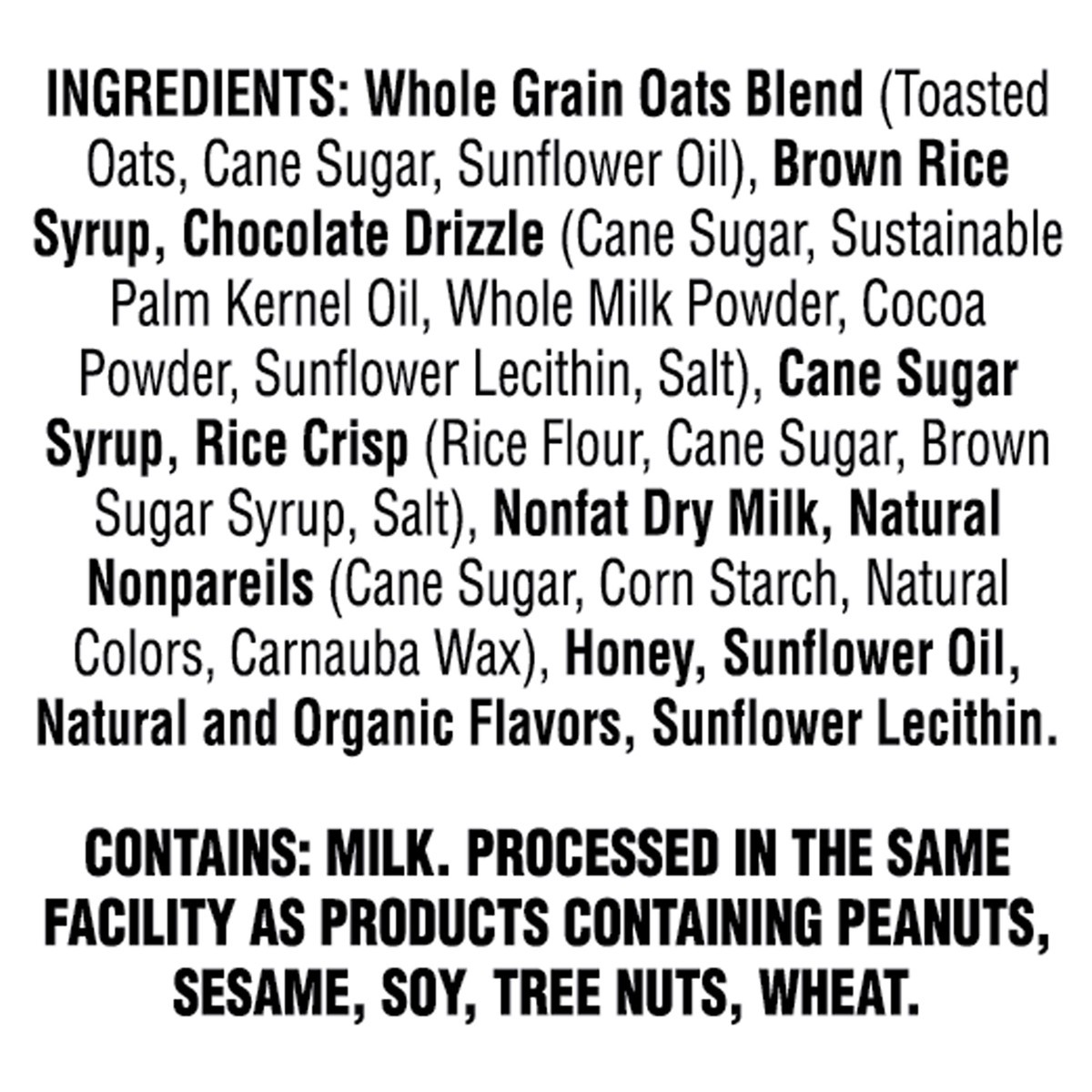 Whole Grain Oats Blend (Toasted Oats, Cane Sugar, Sunflower Oil), Brown Rice Syrup, Chocolate Drizzle (Cane Sugar, Sustainable Palm Kernel Oil, Whole Milk Powder, Cocoa Powder, Sunflower Lecithin, Sal…