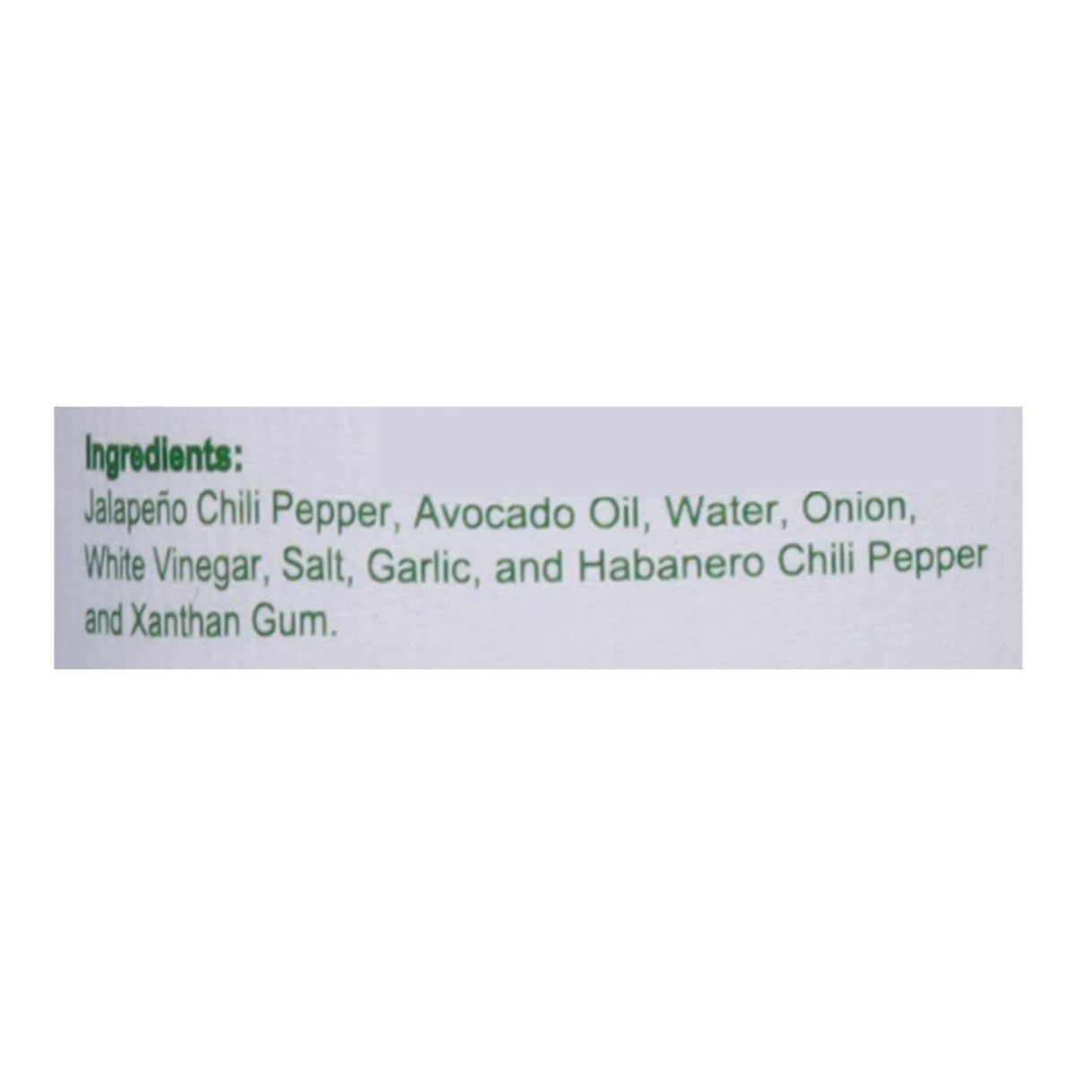 Jalapeno Chili Pepper, Avocado Oil, Water, Onion, White Vinegar, Salt, Garlic, and Habanero Chili Pepper and Xanthan Gum.