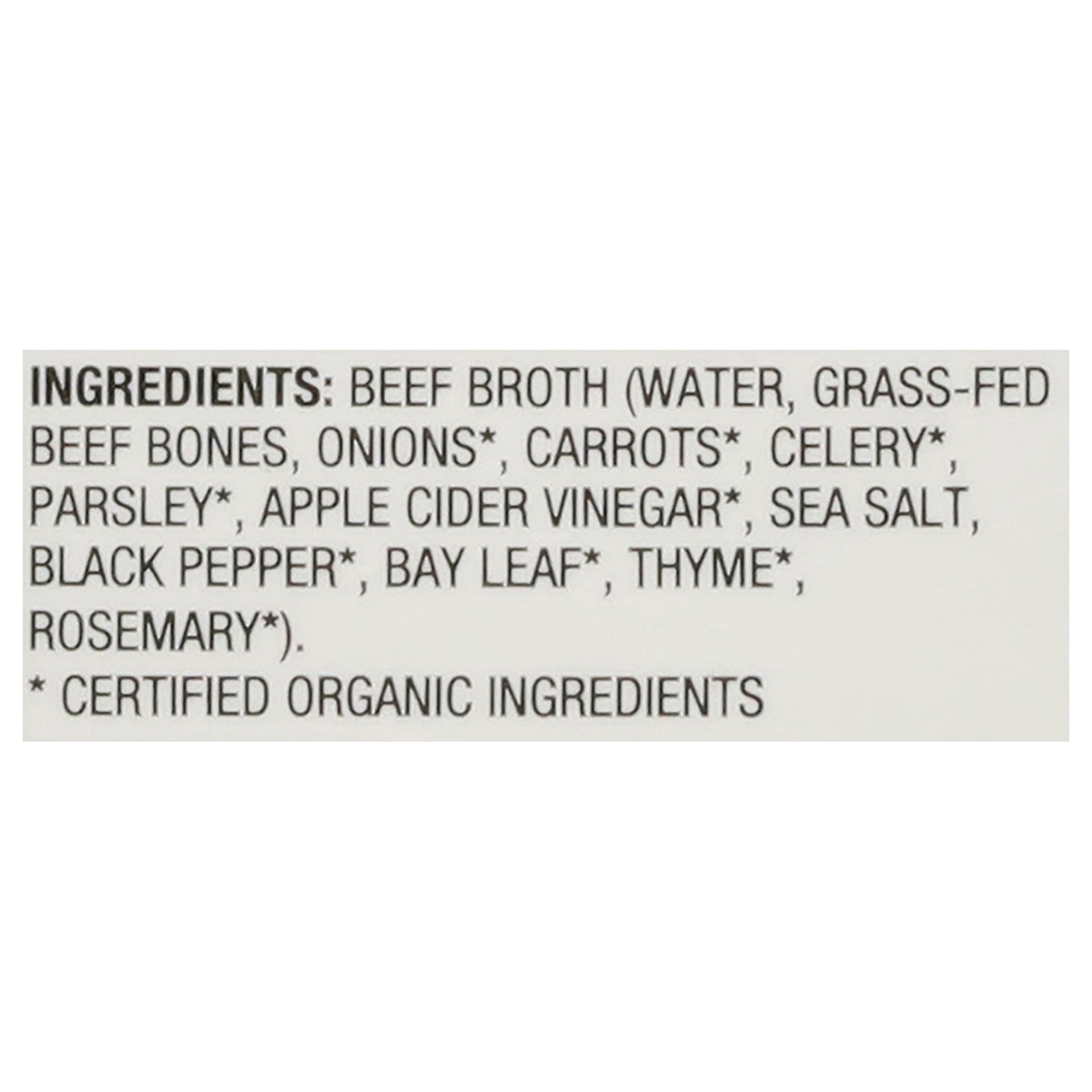 Beef Broth (Water, Grass-Fed Beef Bones, Onions*, Carrots*, Celery*, Parsley*, Apple Cider Vinegar*, Sea Salt, Black Pepper*, Bay Leaf*, Thyme*, Rosemary*). * Certified Organic Ingredients.