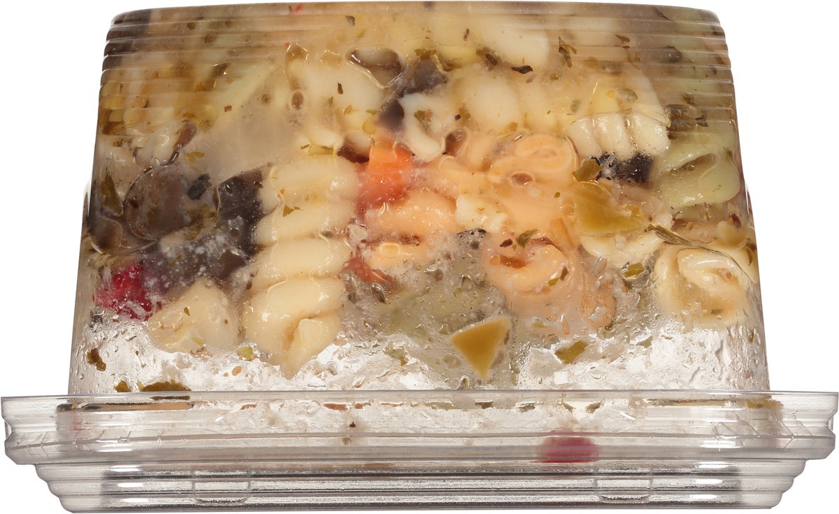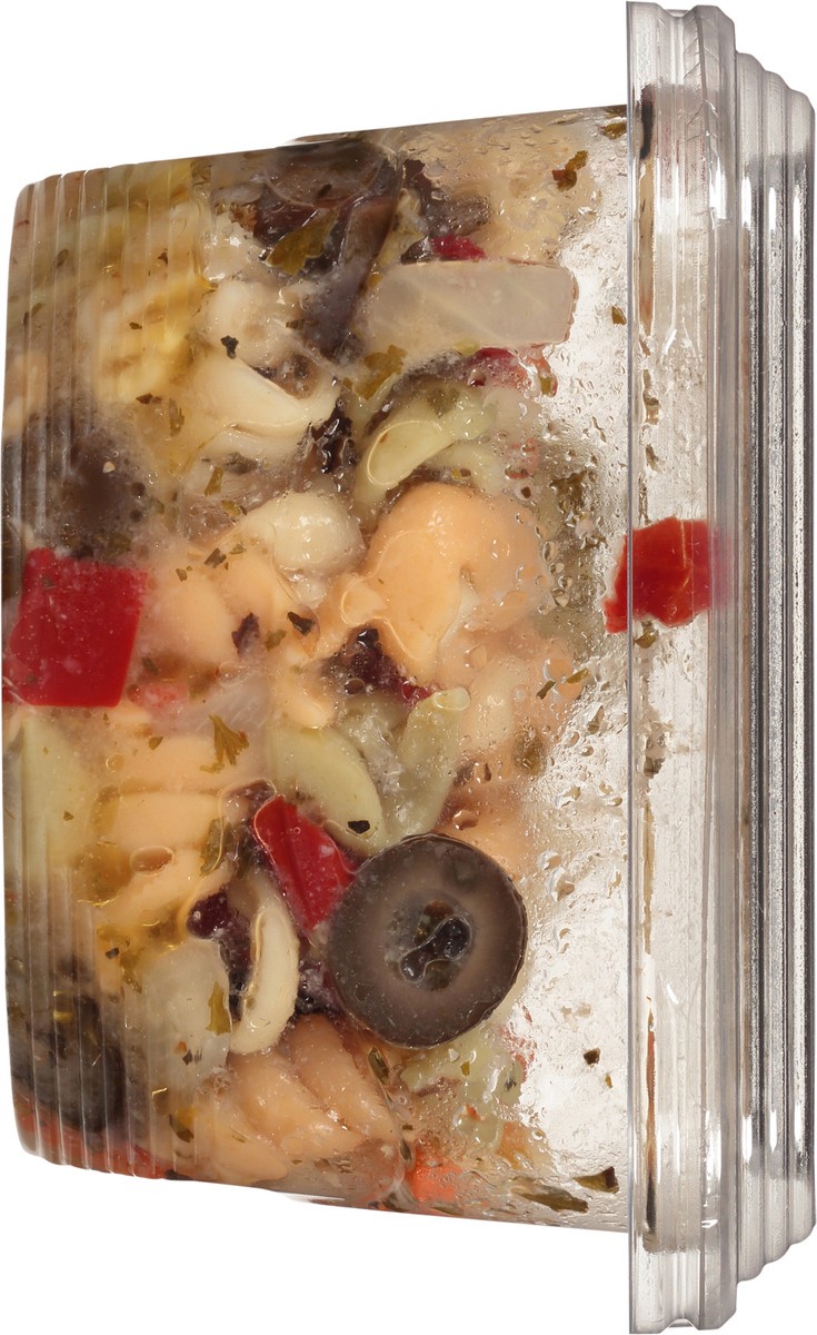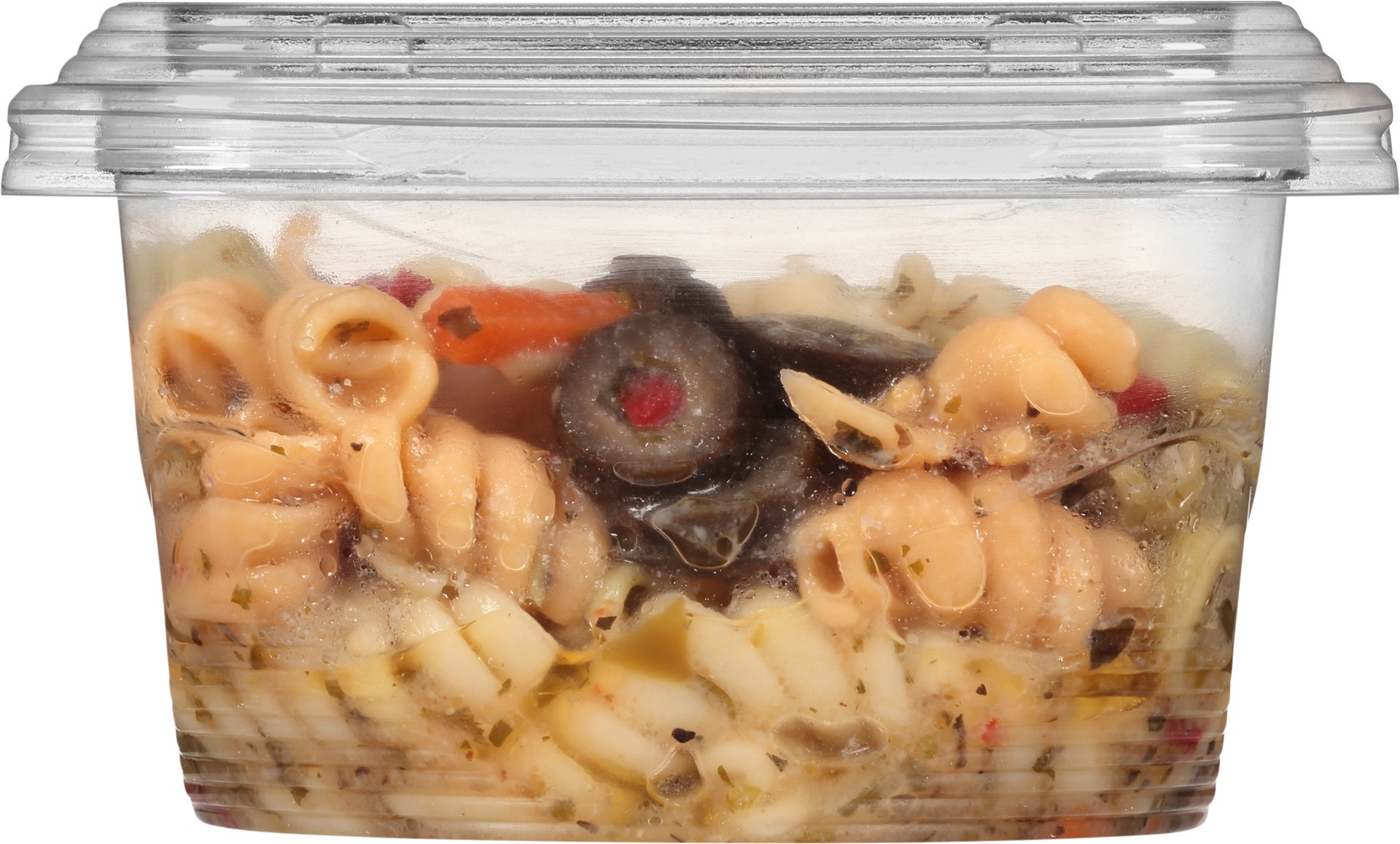 Our al dente rotini pasta is tossed with a trio of fresh diced bell peppers, onions, and sliced black olives, all mixed with a light garlic vinaigrette.