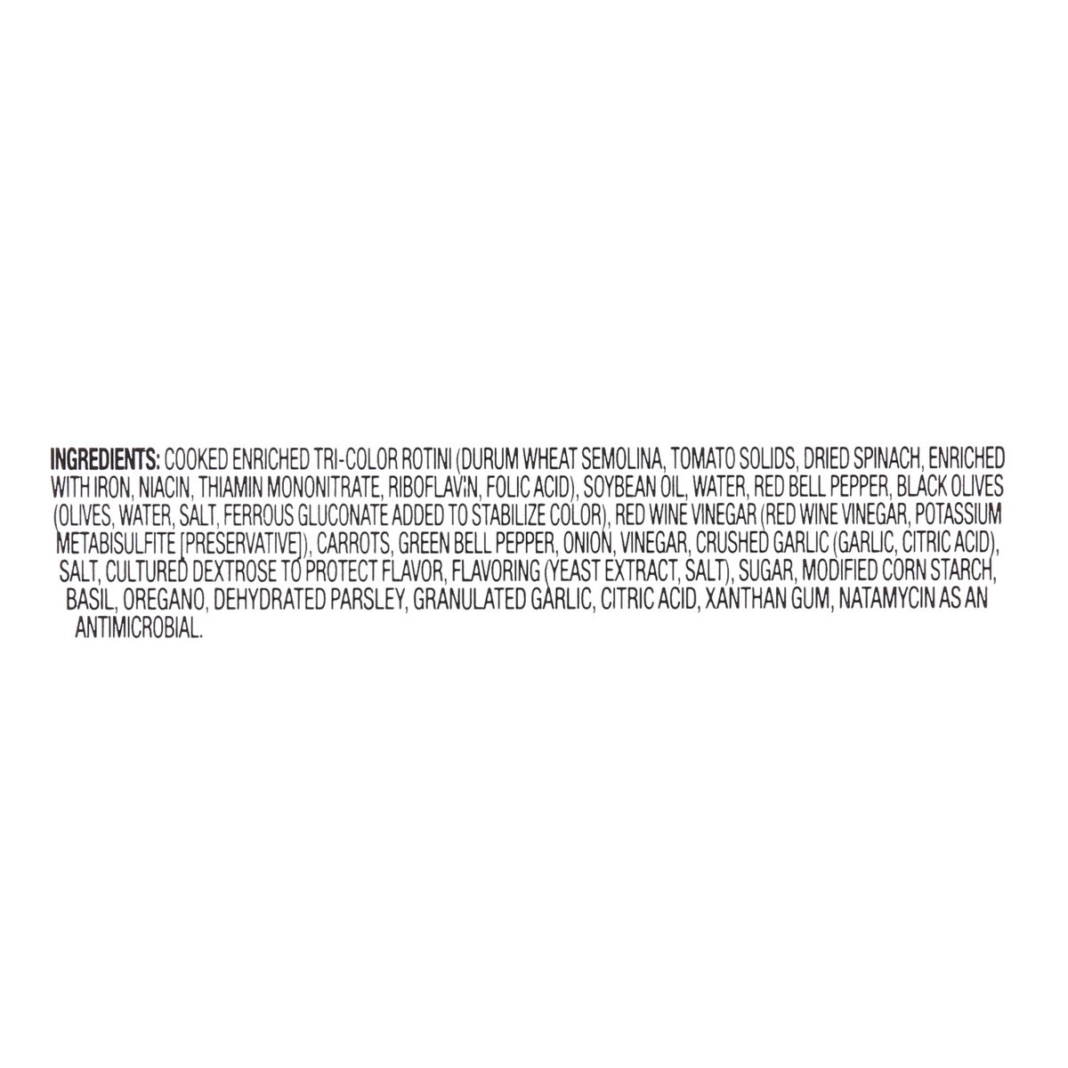 Cooked Enriched Tri-Color Rotini (Durum Wheat Semolina, Tomato Solids, Dried Spinach, Enriched with Iron, Niacin, Thiamin Mononitrate, Riboflavin, Folic Acid), Soybean Oil, Water, Red Bell Pepper, Bla…