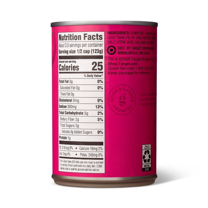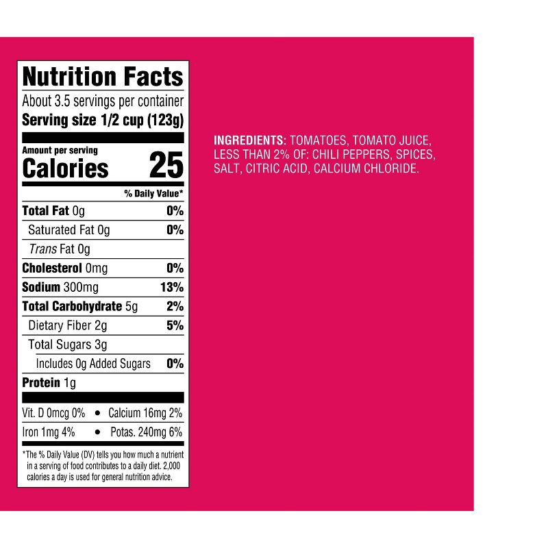 TOMATOES, TOMATO JUICE, LESS THAN 2% OF: CHILI PEPPERS, SPICES, SALT, CITRIC ACID, CALCIUM CHLORIDE.