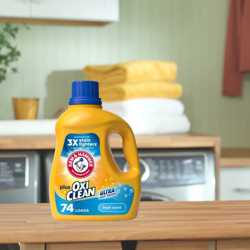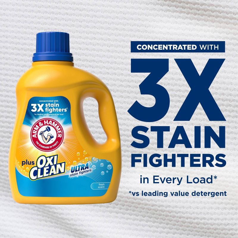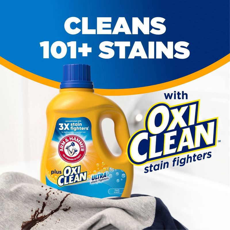 - Stain-removing detergent: 96.2 fl oz bottle of ARM & HAMMER Plus OxiClean Ultra Stain Fighters Liquid Laundry Detergent, Fresh Scent; forces out stubborn stains with OxiClean stain fighters