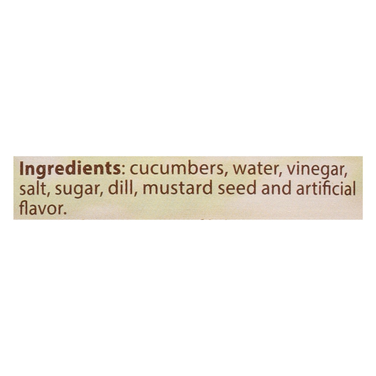 Cucumbers, Water, Vinegar, Salt, Sugar, Dill, Mustard Seed and Artificial Flavor.