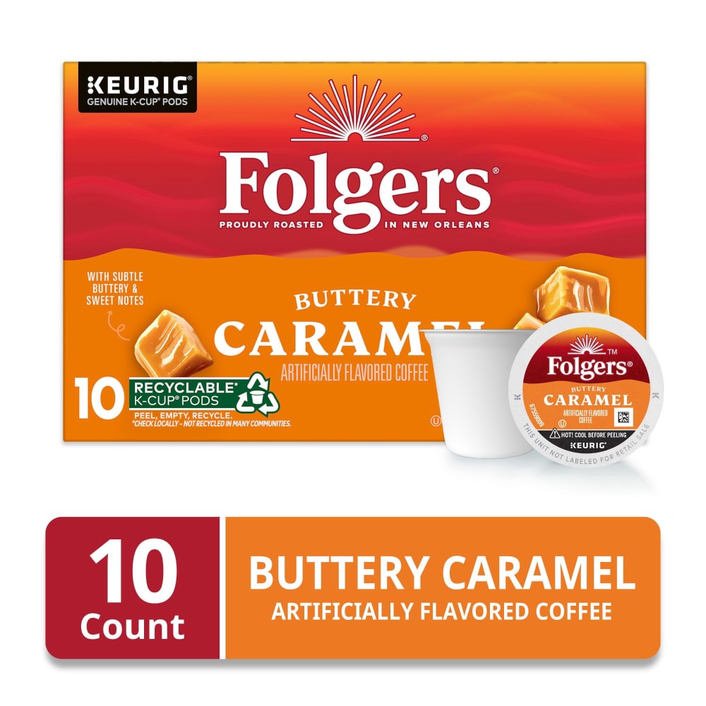 - Contains one (1) box of 10 Folgers Buttery Caramel artificially flavored coffee Keurig K-Cup pods