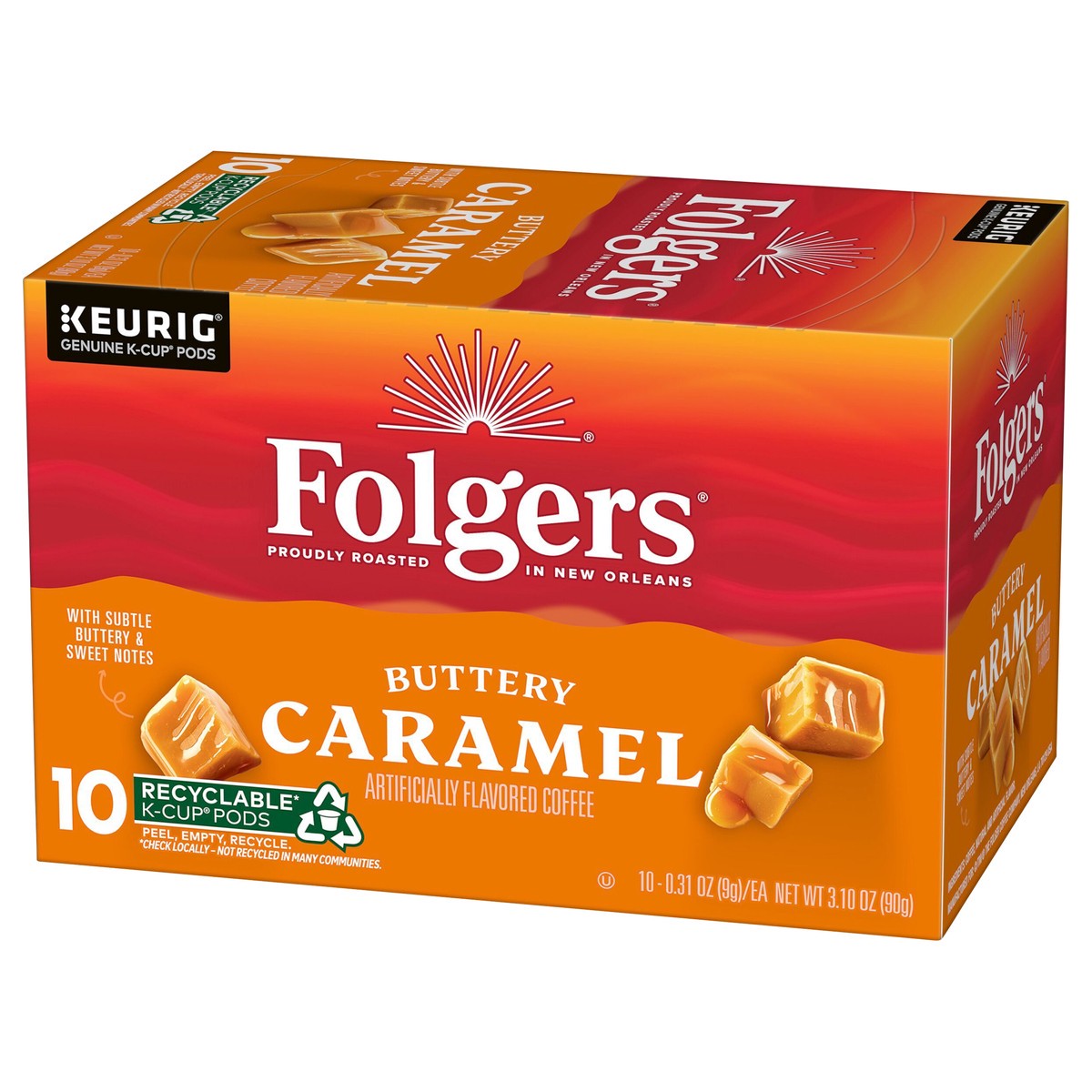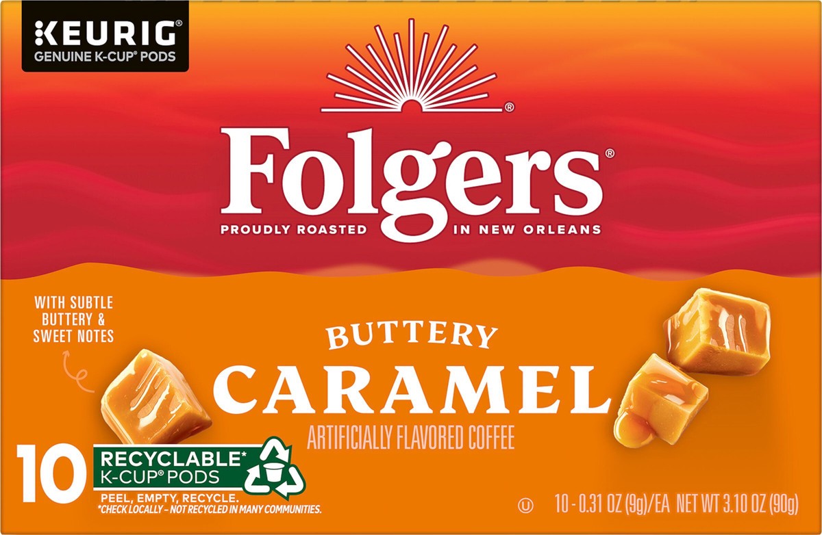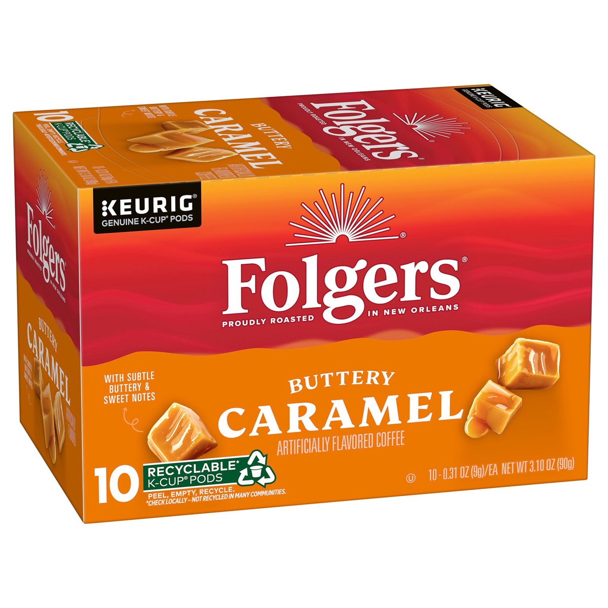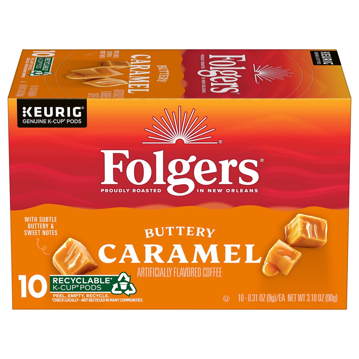 - Contains one (1) box of 10 Folgers Buttery Caramel artificially flavored coffee Keurig K-Cup pods