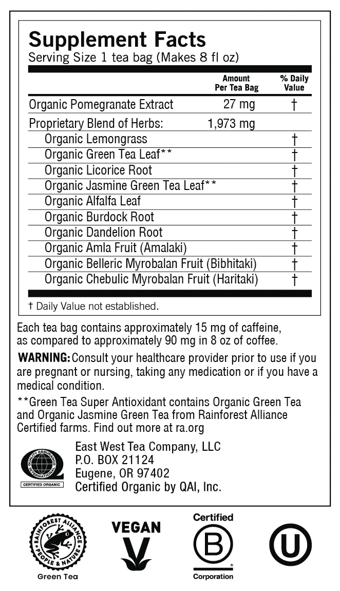 Proprietary Blend of Herbs: Organic Lemongrass, Organic Green Tea Leaf (Green Tea Super Antioxidant Contains Organic Green Tea and Organic Jasmine Green Tea from Rainforest Alliance Certified Farms, F…