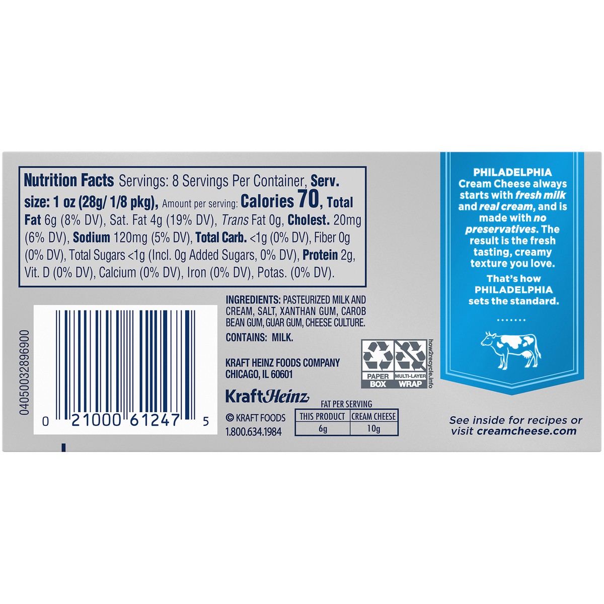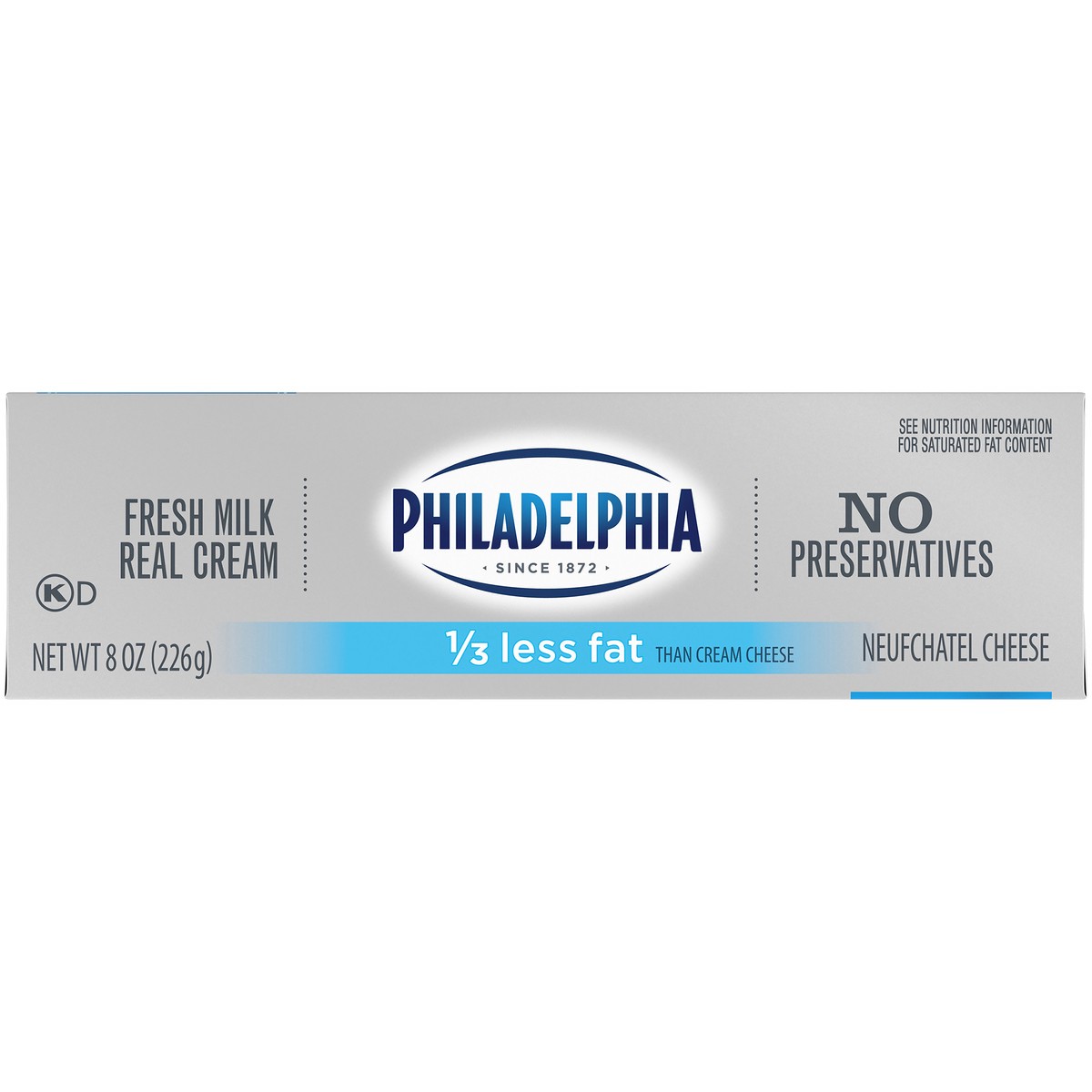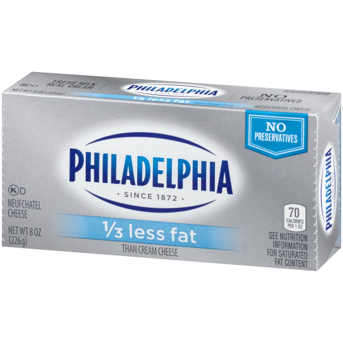 Philadelphia 1/3 Less Fat Cream Cheese delivers the same delicious taste of cream cheese with 1/3 less fat. Our 1/3 Less Fat cream cheese is made with fresh milk and cream. It's perfect for making cre…