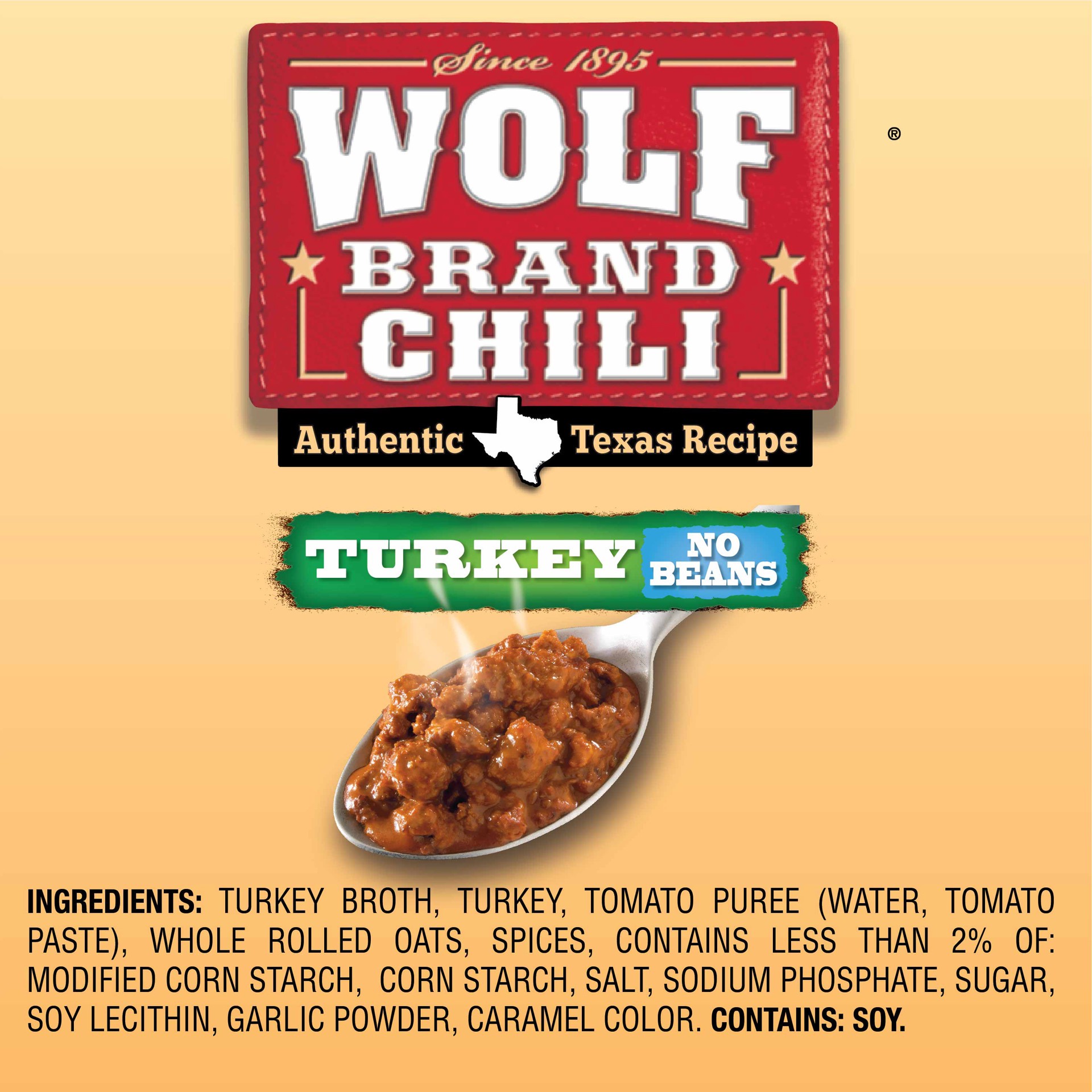 Taste the bold flavor of Texas chili in every bite of WOLF BRAND Turkey Chili Without Beans. This turkey chili with no beans is made with ground turkey, vine-ripened tomatoes and a unique blend of sea…