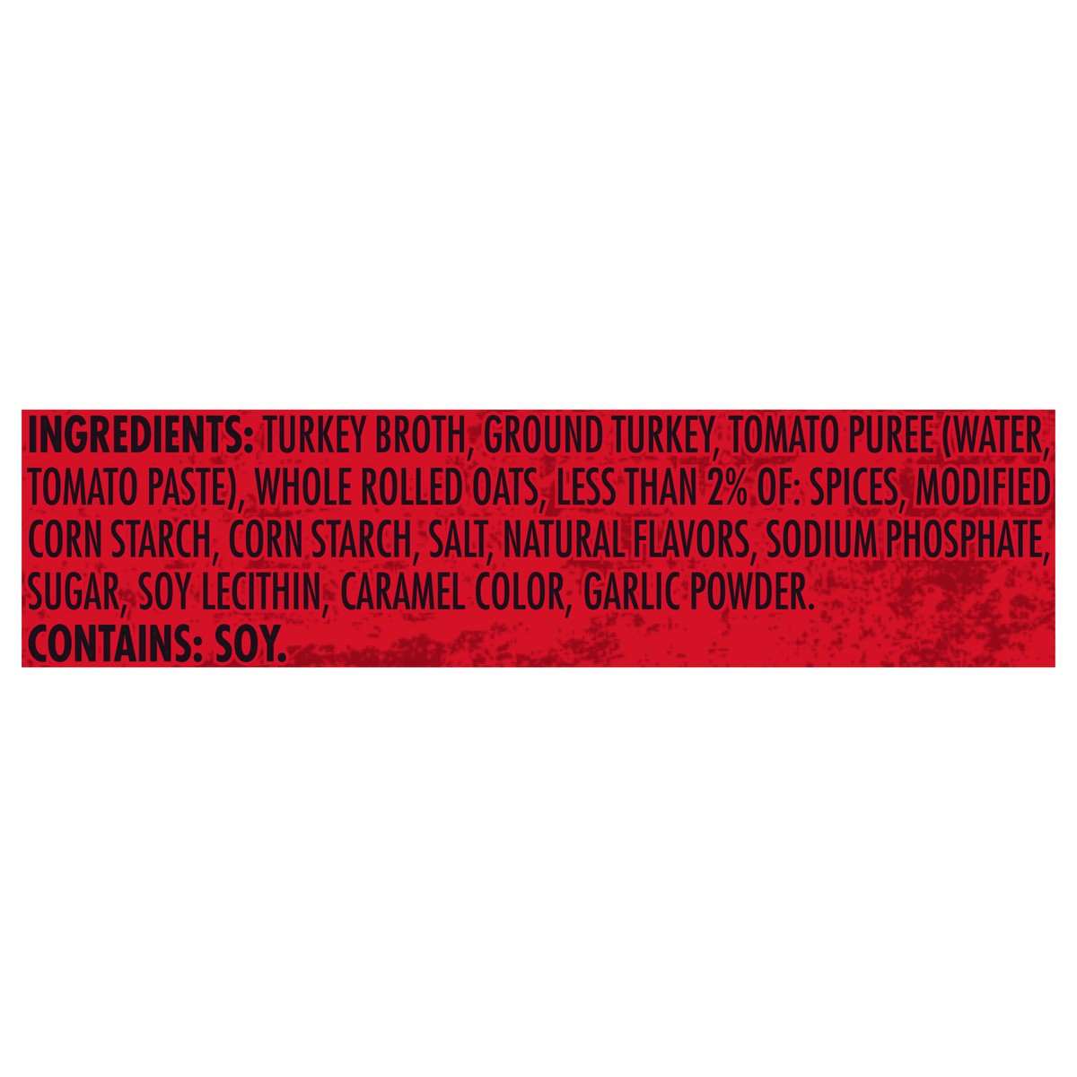 Turkey Broth, Ground Turkey, Tomato Puree (Water, Tomato Paste), Whole Rolled Oats, Less than 2% of: Spices, Modified Corn Starch, Corn Starch, Salt, Natural Flavors, Sodium Phosphate, Sugar, Soy Leci…