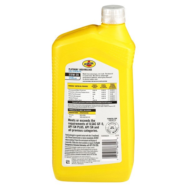 Pennzoil Platinum High Mileage Full Synthetic Motor Oil with PurePlus Technology - 0W