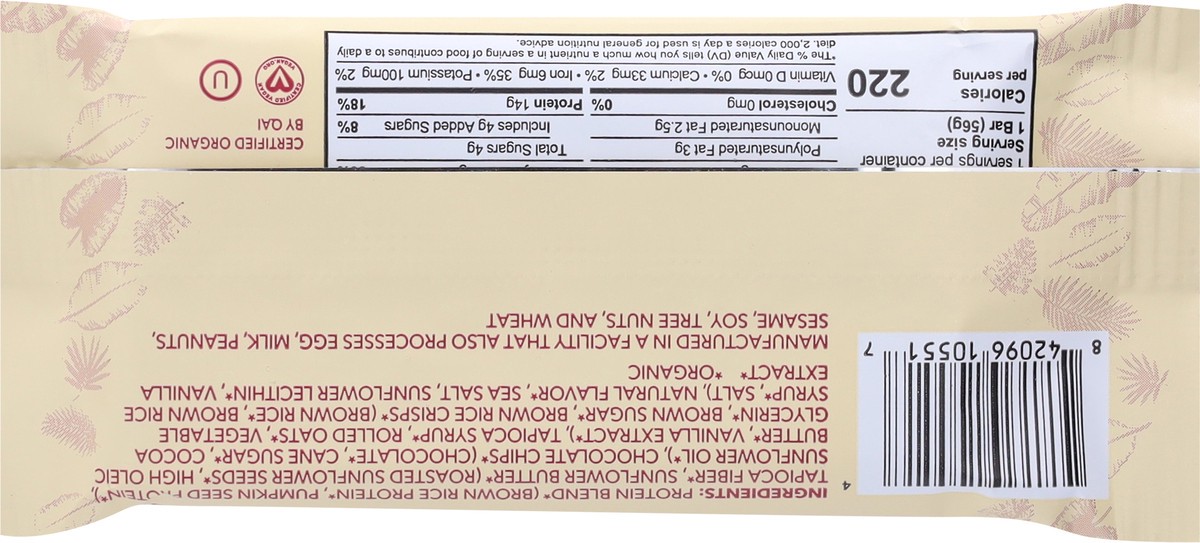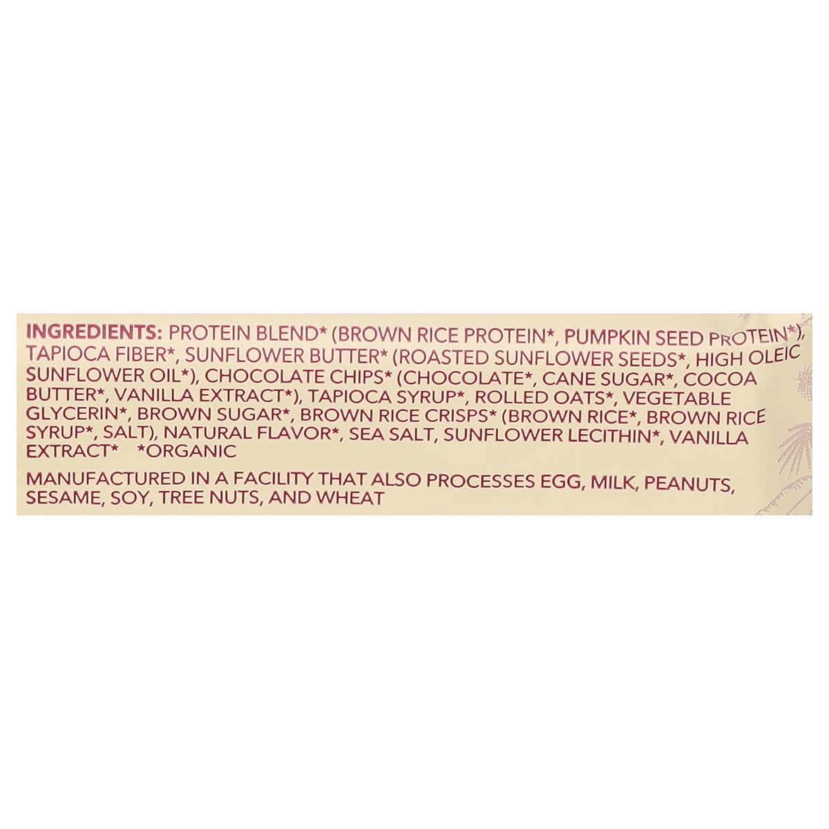 Protein Blend* (Brown Rice Protein*, Pumpkin Seed Protein*), Tapioca Fiber*, Sunflower Butter* (Roasted Sunflower Seeds*, High Oleic Sunflower Oil*), Chocolate Chips* (Chocolate*, Cane Sugar*, Cocoa B…