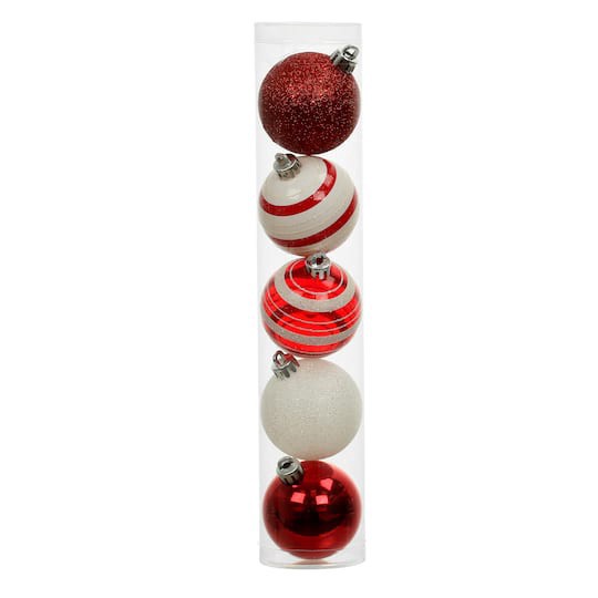 Purchase the 5 Pack 2.2" Red & White Shatterproof Ball Ornaments by Ashland at Michaels. This set of ball ornaments features glitter, striped, and solid designs in red and white. These ornaments will …