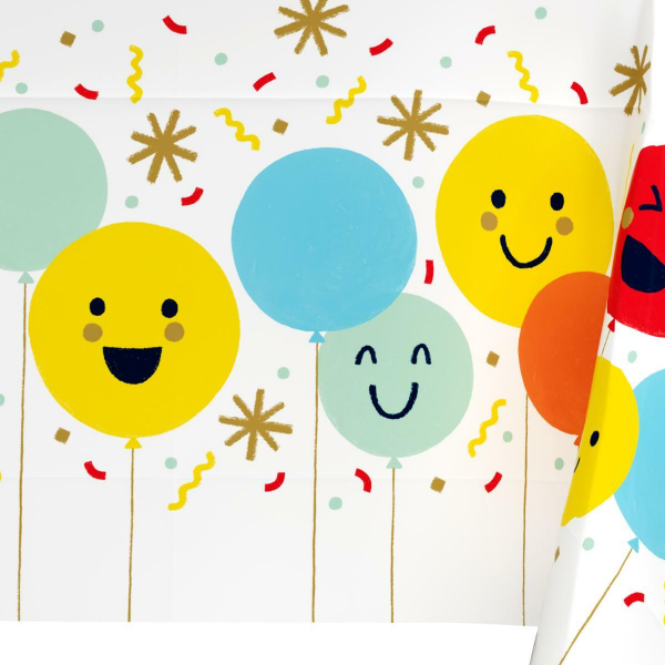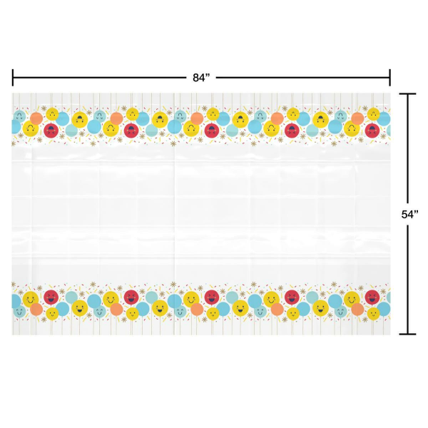 Make the party table pop with this cute and fun plastic table cover. The bright white tablecloth features a design around the edges of bunches of smiling balloons in bright shades of blue, orange, pin…