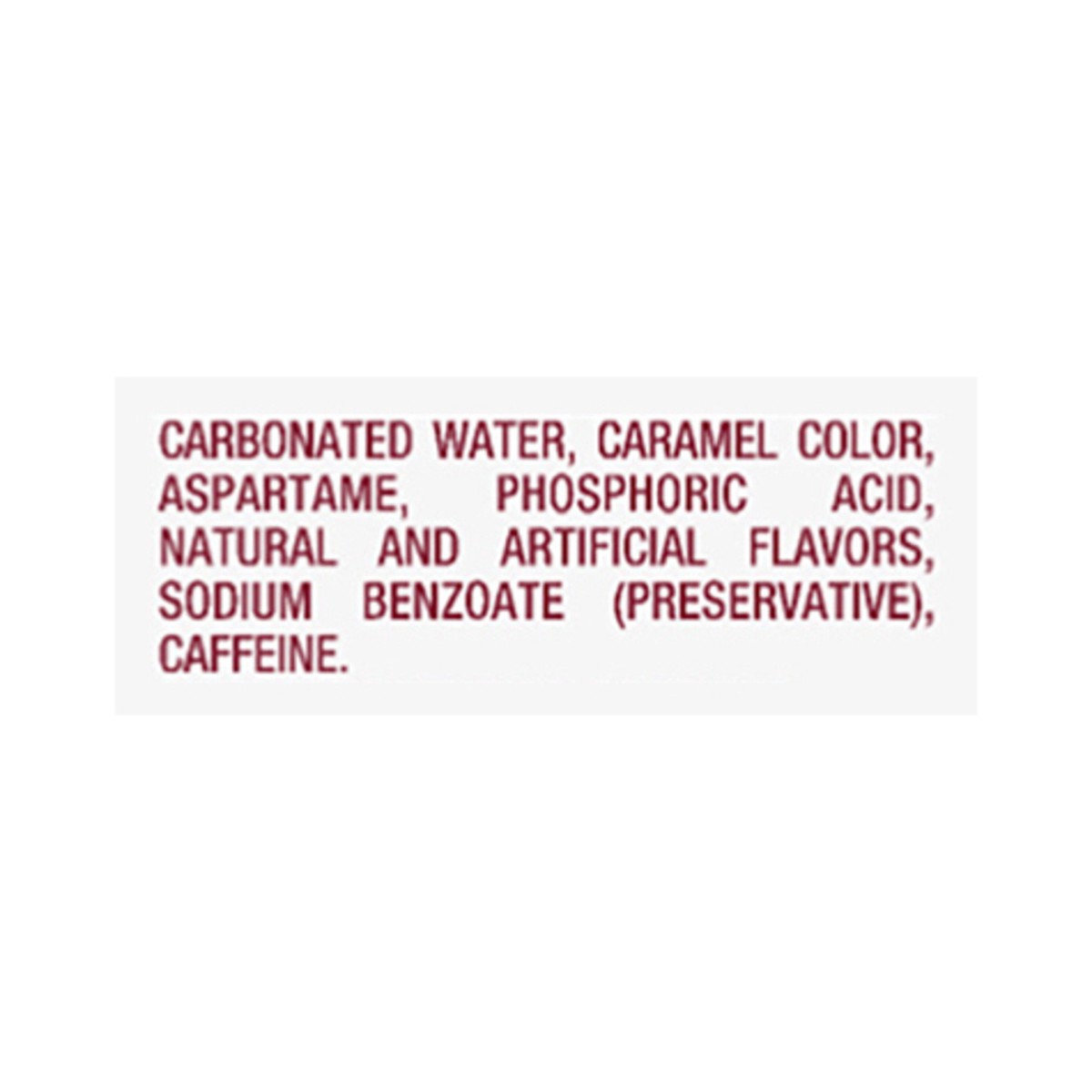 Carbonated Water, Caramel Color, Aspartame, Phosphoric Acid, Natural and Artificial Flavors, Sodium Benzoate (Preservative), Caffeine.