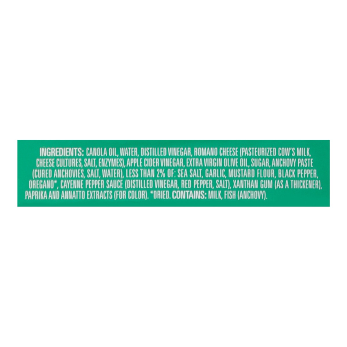 Canola Oil, Water, Distilled Vinegar, Romano Cheese (Pasteurized Cow's Milk, Cheese Cultures, Salt, Enzymes), Apple Cider Vinegar, Extra Virgin Olive Oil, Sugar, Anchovy Paste (Cured Anchovies, Salt, …