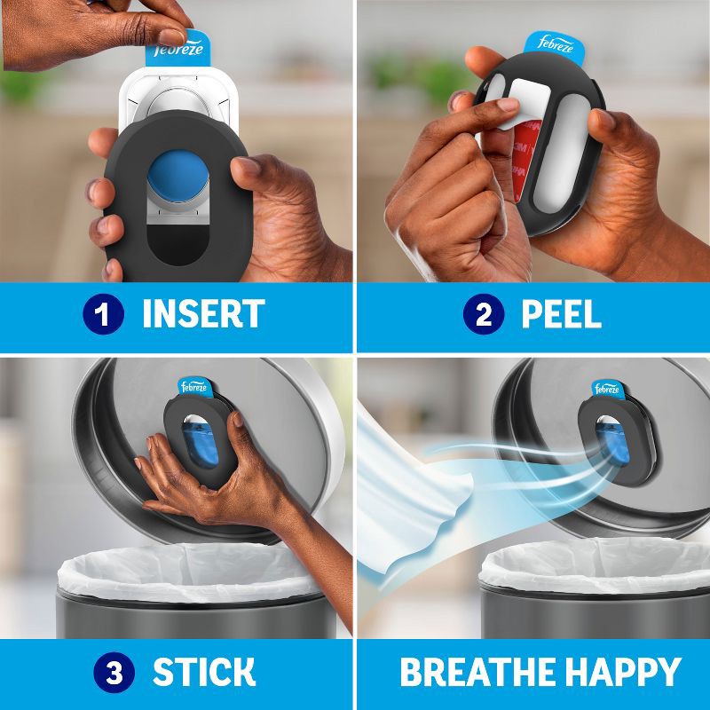 - Just insert, peel, and stick the adhesive holder to your trash can to start fighting odors immediately. The secure, adhesive holder is easily refillable.