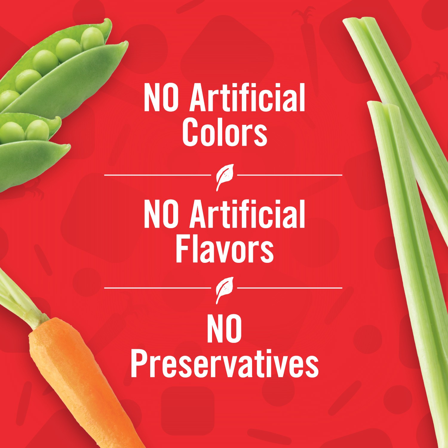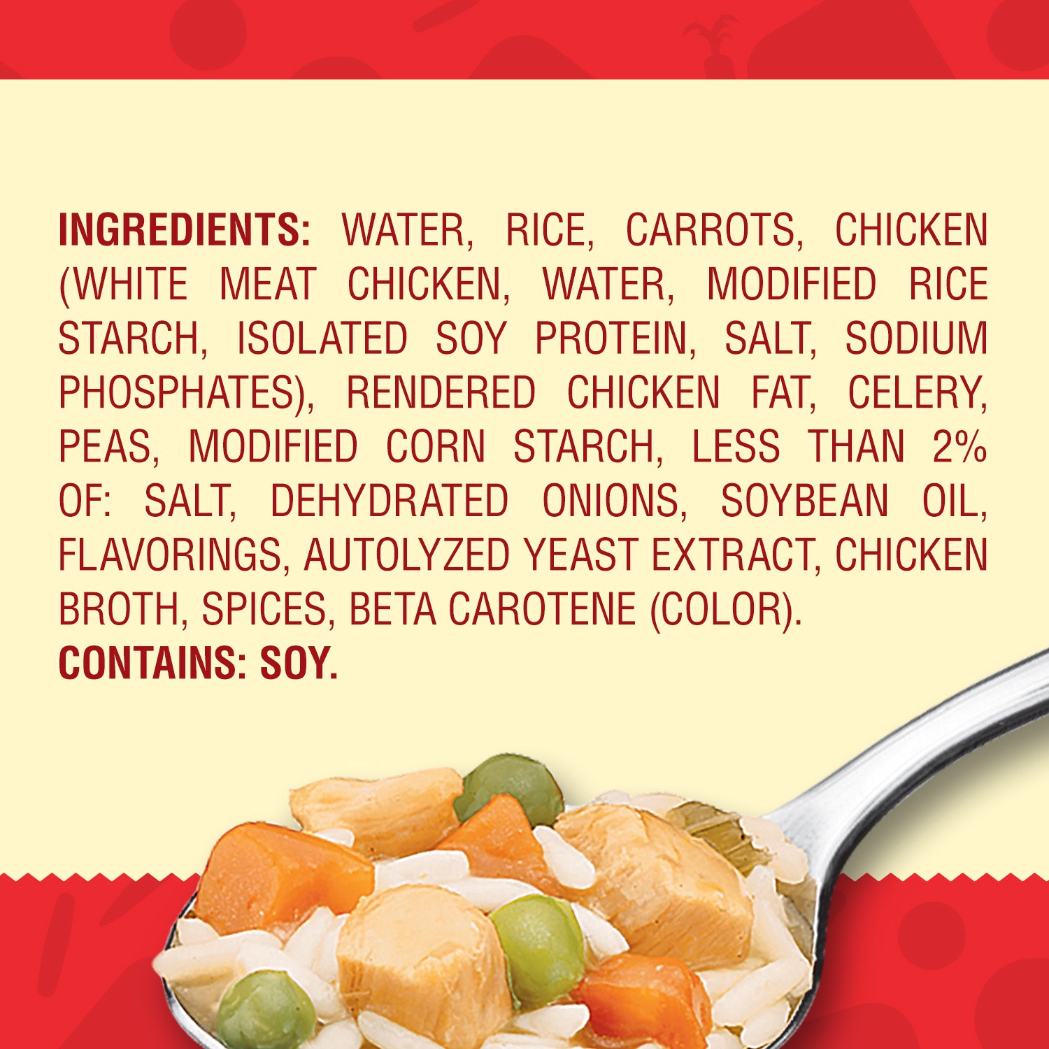 Water, White Rice, Carrots, Cooked Chicken (White Meat Chicken, Water, Modified Rice Starch, Isolated Soy Protein, Salt, Sodium Phosphates), Rendered Chicken Fat, Celery, Peas, Modified Corn Starch, L…