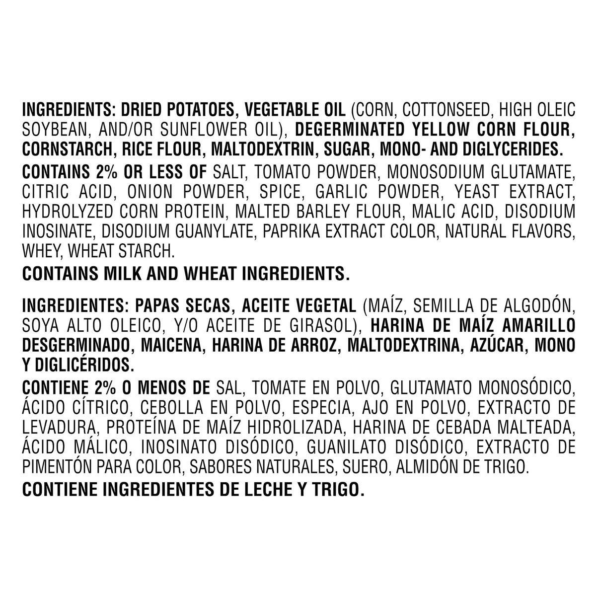 Ingredients: Dried Potatoes, Vegetable Oil (Corn, Cottonseed, High Oleic Soybean, And/Or Sunflower Oil), Degerminated Yellow Corn Flour, Cornstarch, Rice Flour, Maltodextrin, Sugar, Mono- And Diglycer…