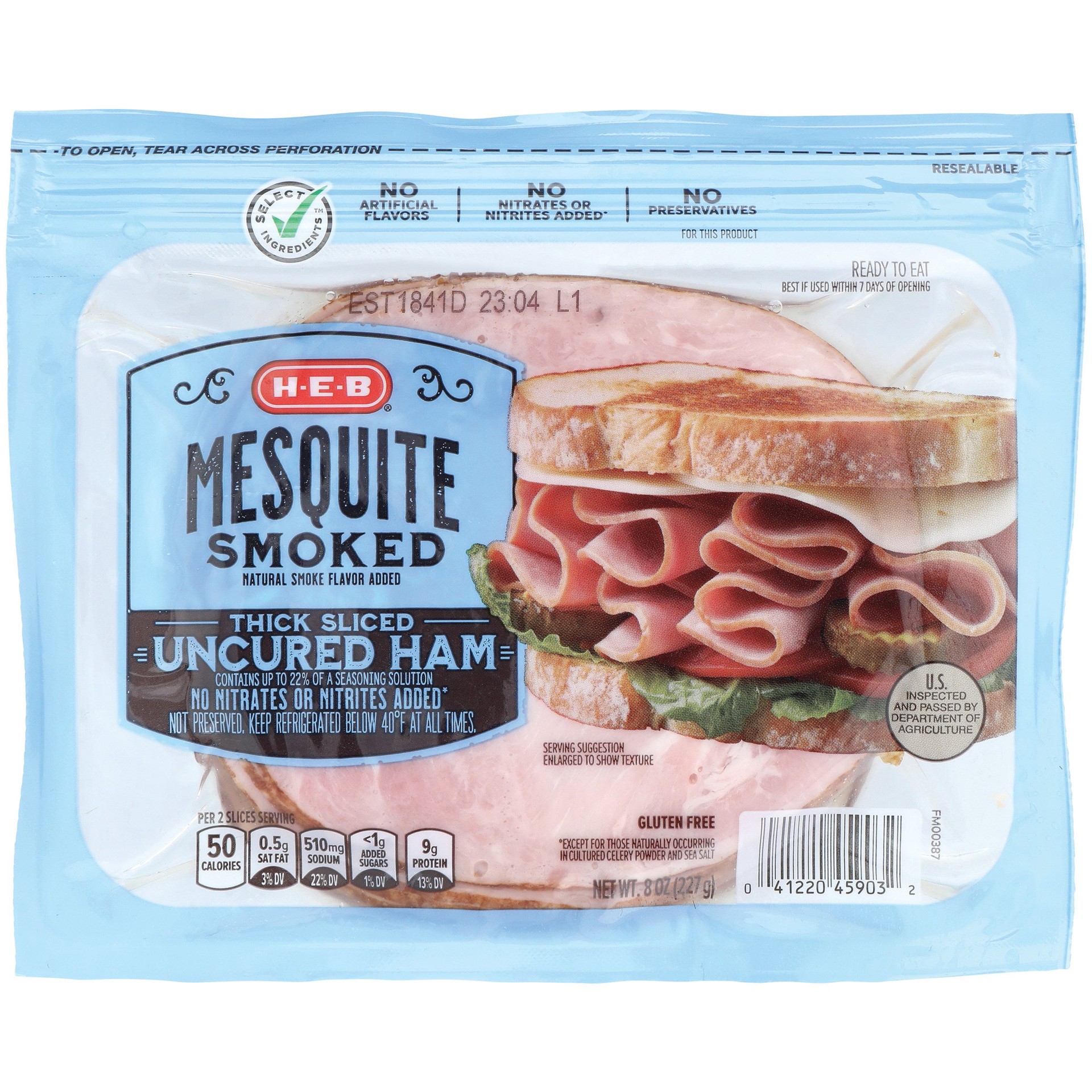 Treat your taste buds to the mesquite-smoked taste of this H-E-B thick-sliced ham. Great for making sandwiches, it comes in a resealable package that's easy to open and close. Plus, there are no artif…