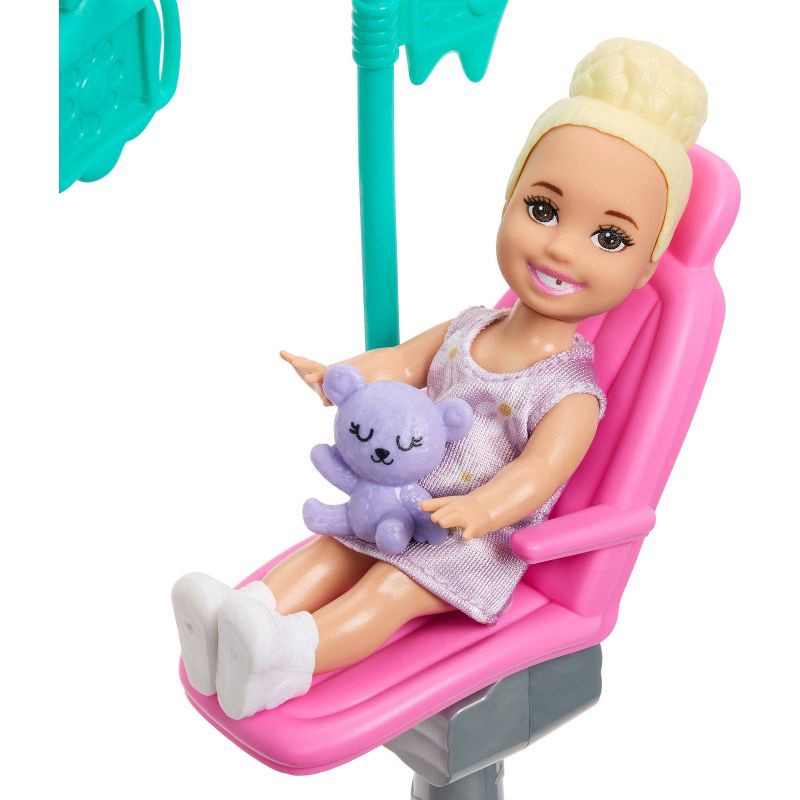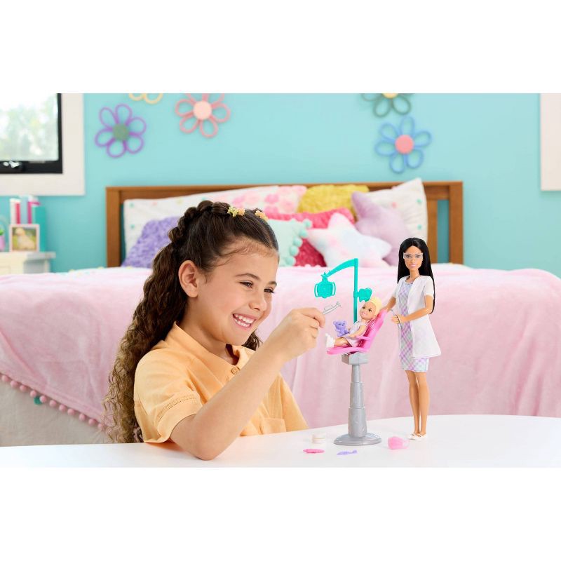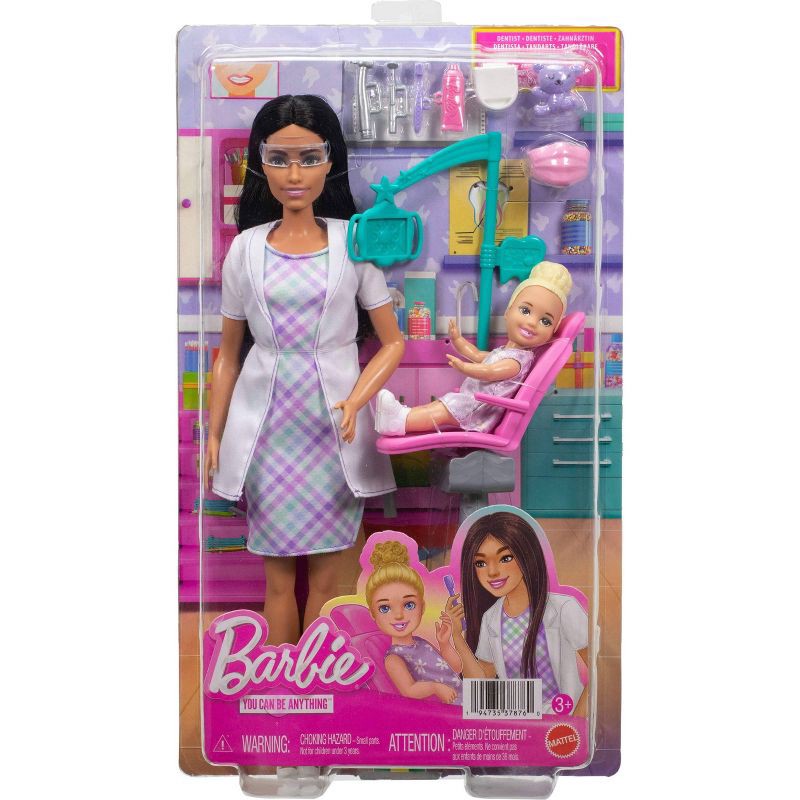 - The career-themed set includes Barbie dentist doll, a small toddler doll, dentist's chair with an overhead 'light' and 8 accessories
