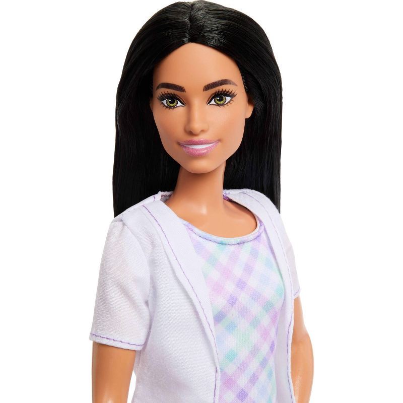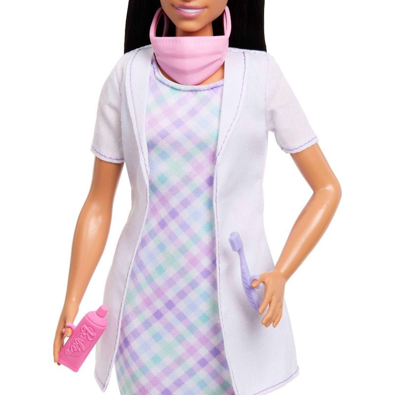 - Wearing a classic white overcoat, Barbie Dentist doll is prepped and ready for role-play fun!