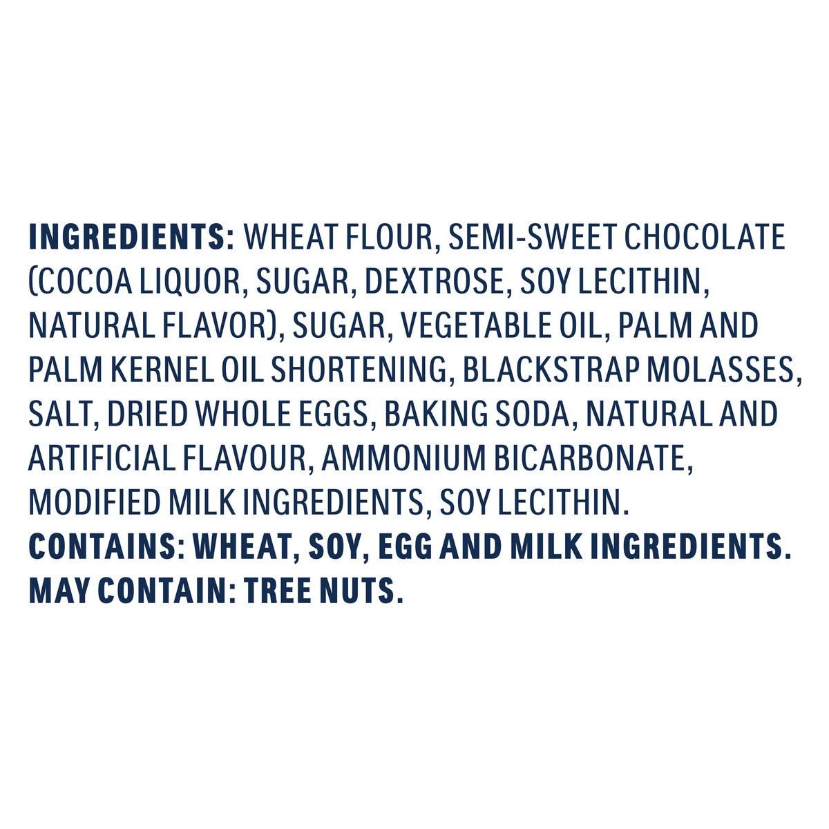 Wheat Flour, Semi-Sweet Chocolate (Cocoa Liquor, Sugar, Dextrose, Soy Lecithin, Natural Flavor), Sugar, Vegetable Oil, Palm and Palm Kernel Oil Shortening, Blackstrap Molasses, Salt, Dried Whole Eggs,…