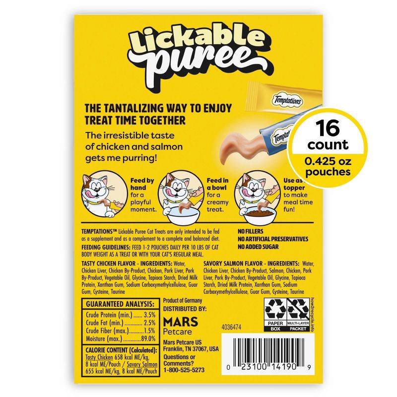 - 16-Pack: Contains eight (8) 0.42 oz. tubes of Temptations Creamy Puree Squeezable Lickable Wet Cat Treats with Chicken and eight (8) 0.42. tubes of Temptations Creamy Puree Squeezable Lickable Wet Cat Treats with Salmon.