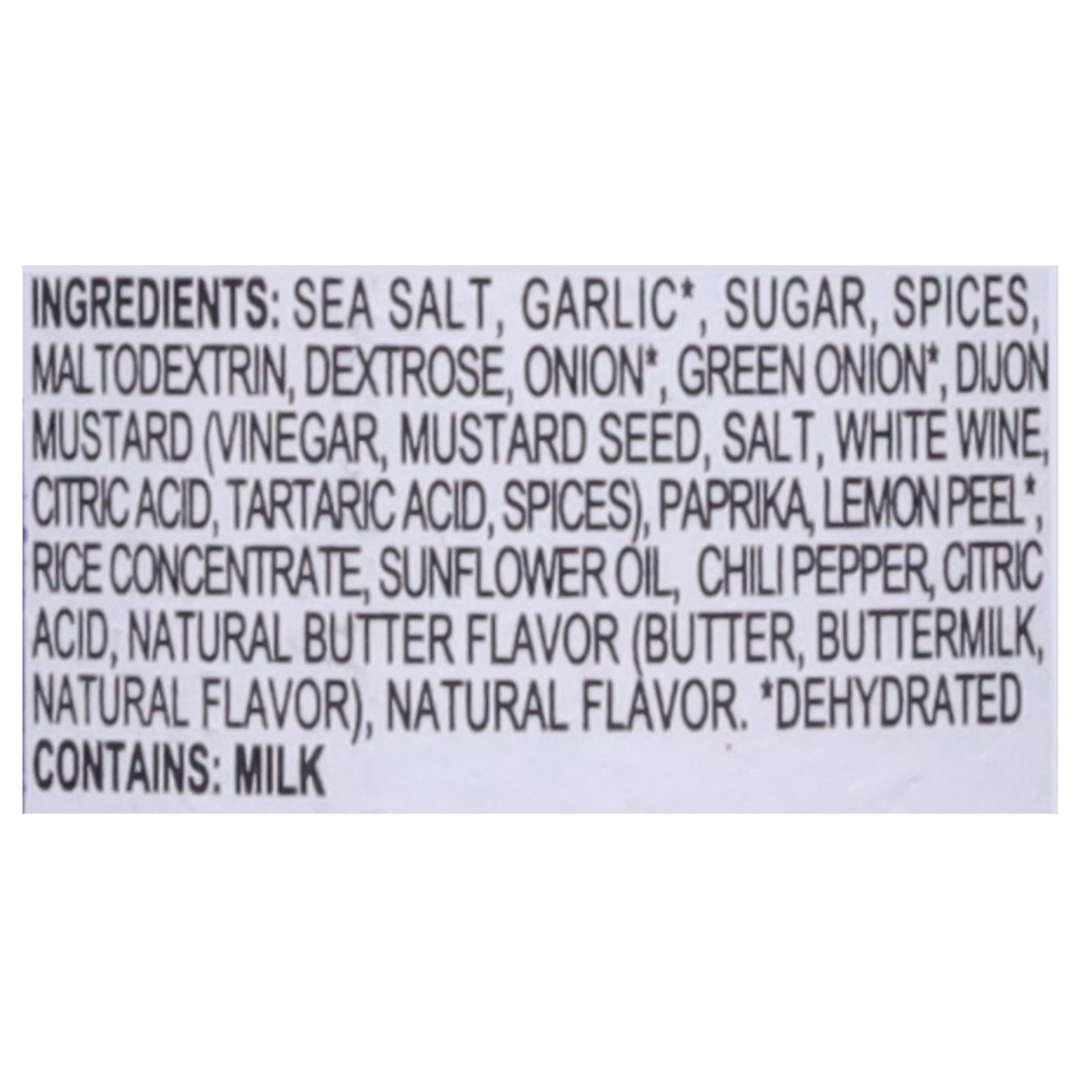 Sea Salt, Garlic*, Sugar, Spices, Maltodextrin, Dextrose, Onion*, Green Onion*, Dijon Mustard (Vinegar, Mustard Seed, Salt, White Wine, Citric Acid, Tartaric Acid, Spices), Paprika, Lemon Peel*, Rice …