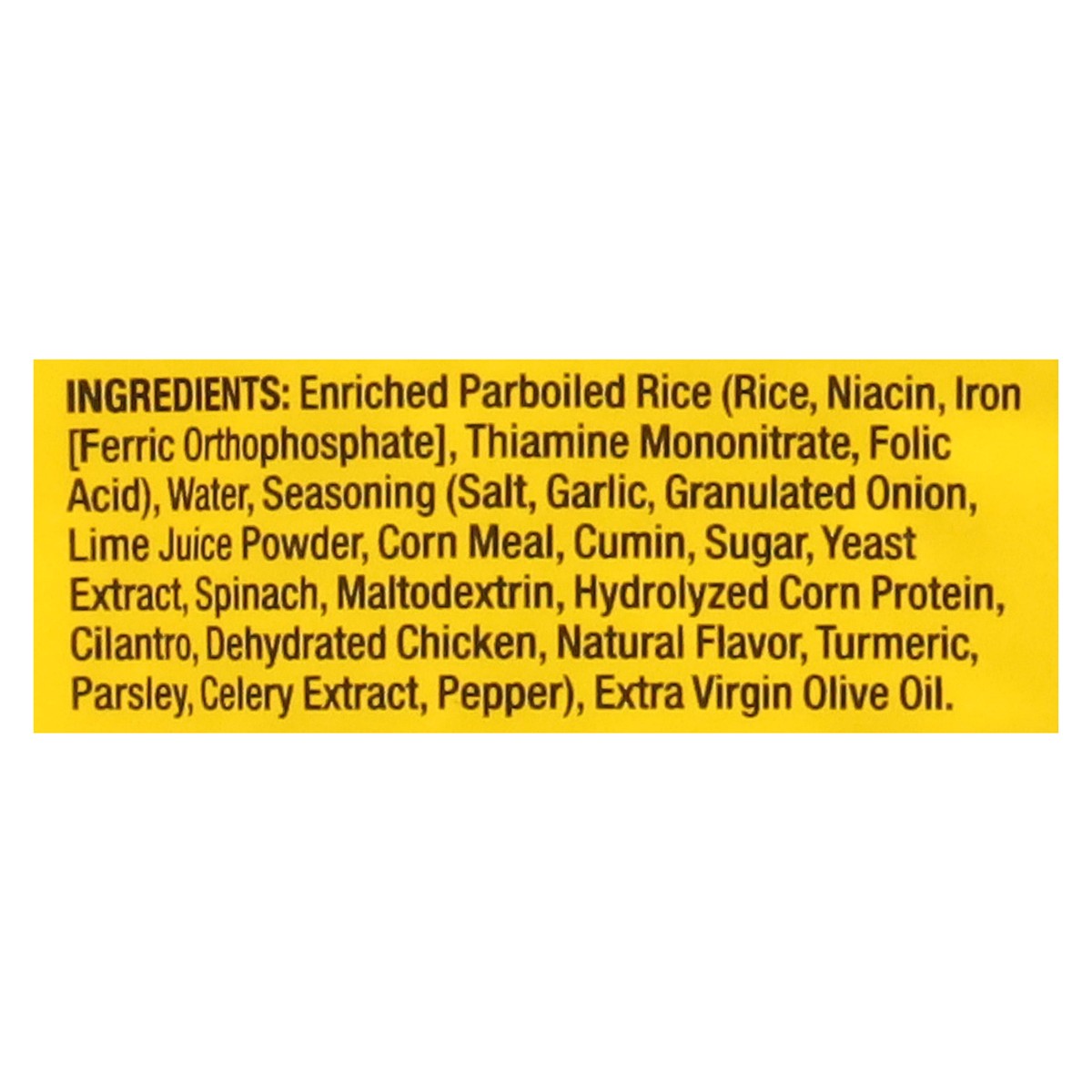 Enriched Parboiled Rice (Rice, Niacin, Iron [Ferric Orthophosphate], Thiamine Mononitrate, Folic Acid), Water, Seasoning (Salt, Garlic, Granulated Onion, Lime Juice Powder, Corn Meal, Cumin, Sugar, Ye…