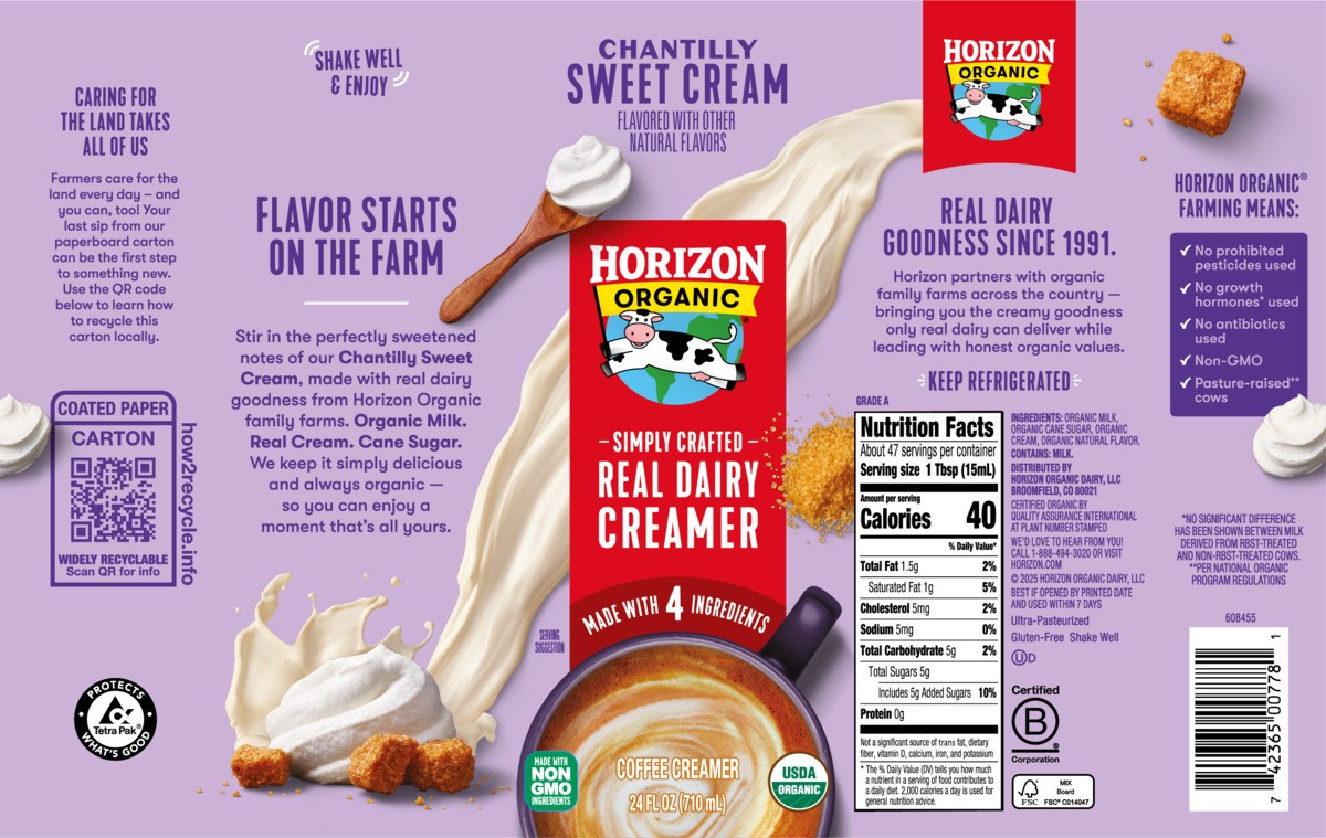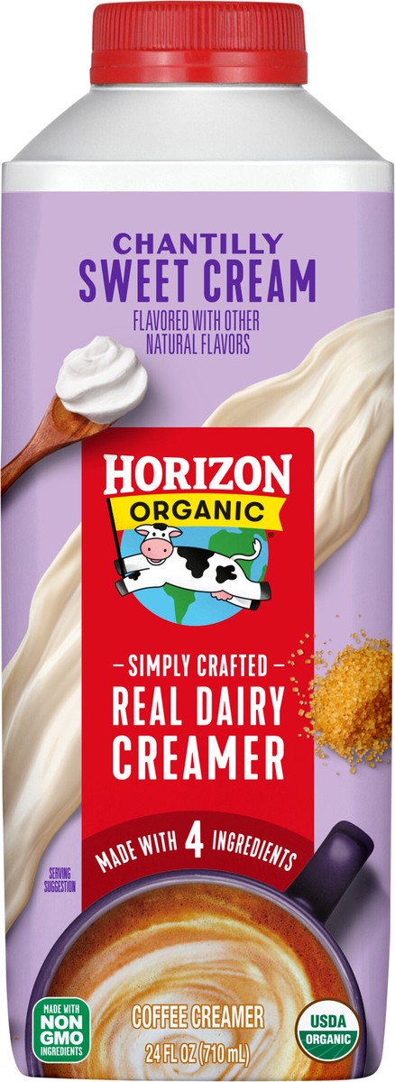 - DELICIOUSLY CREAMY: One 24 fl oz carton of Horizon Organic Real Dairy Chantilly Sweet Cream Coffee Creamer made with organic milk and cream adds rich flavor to your favorite coffee beverages